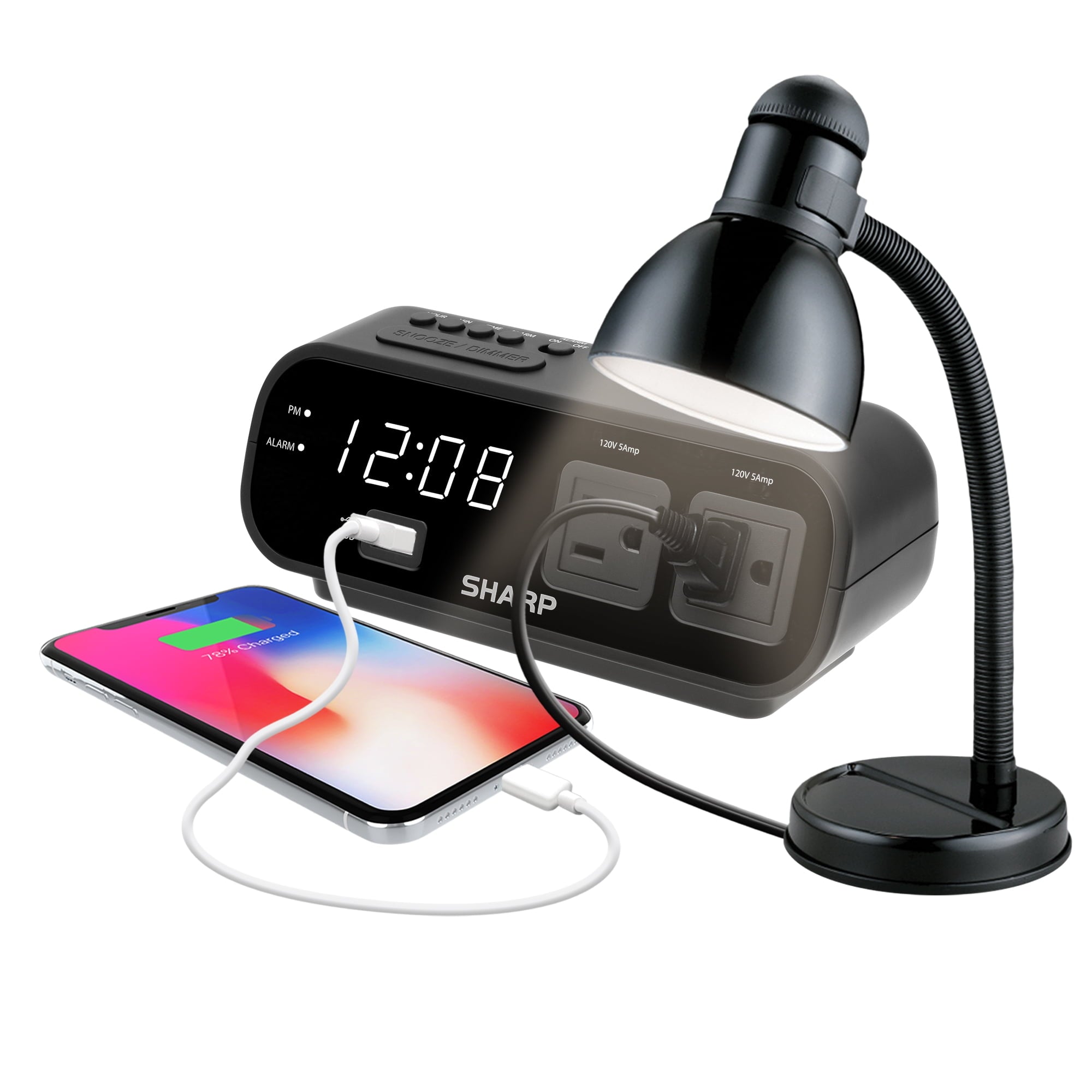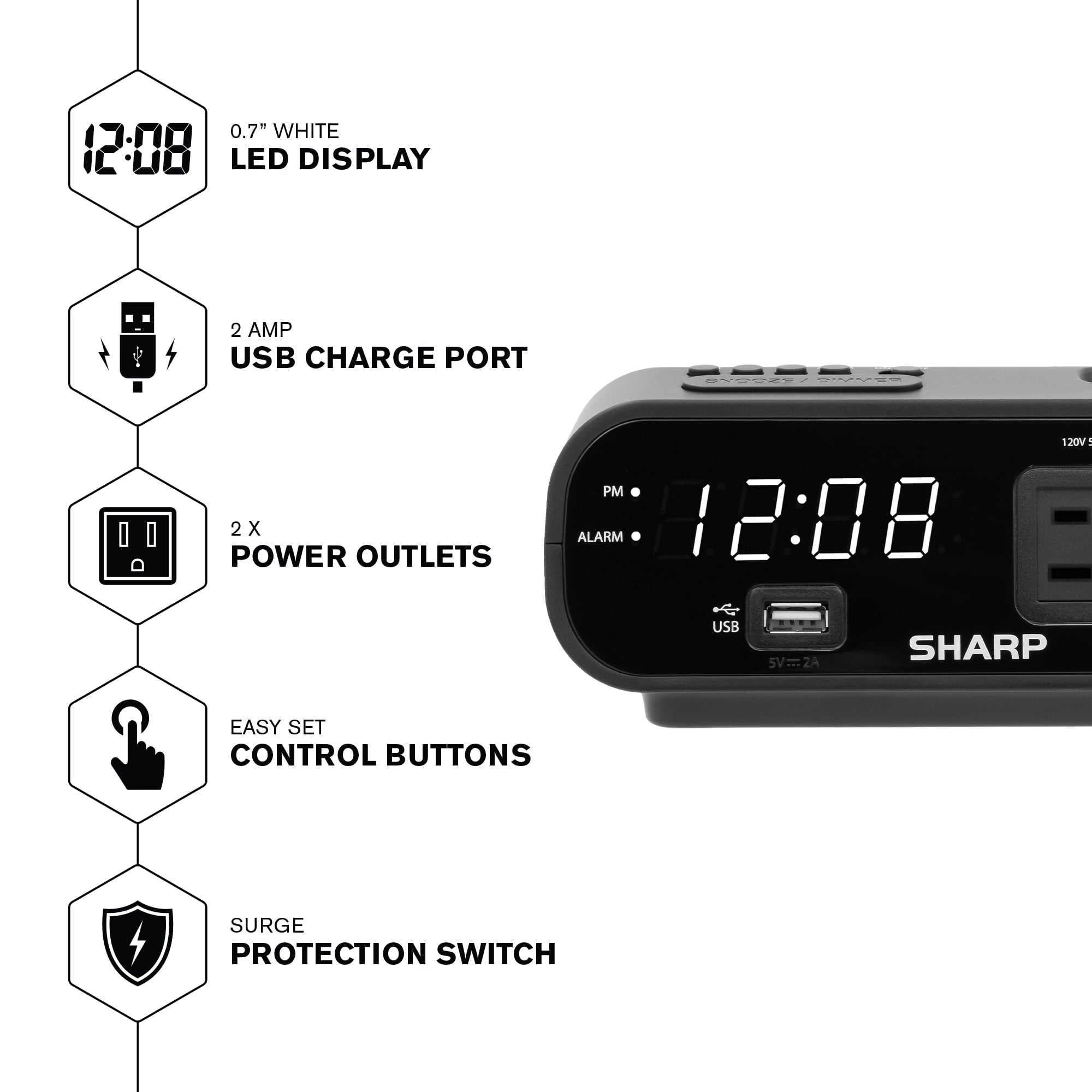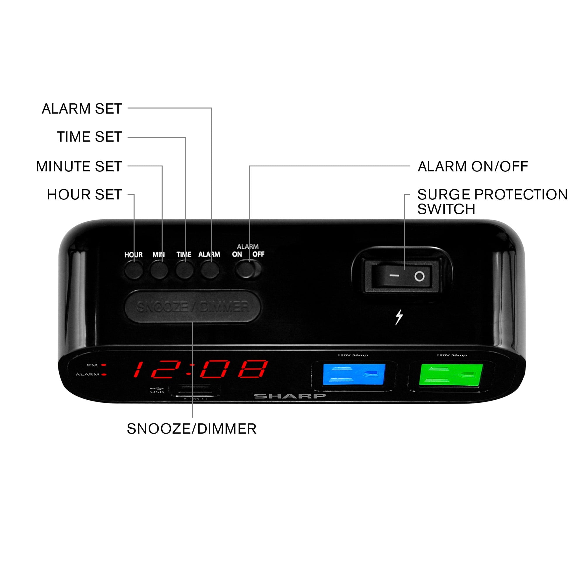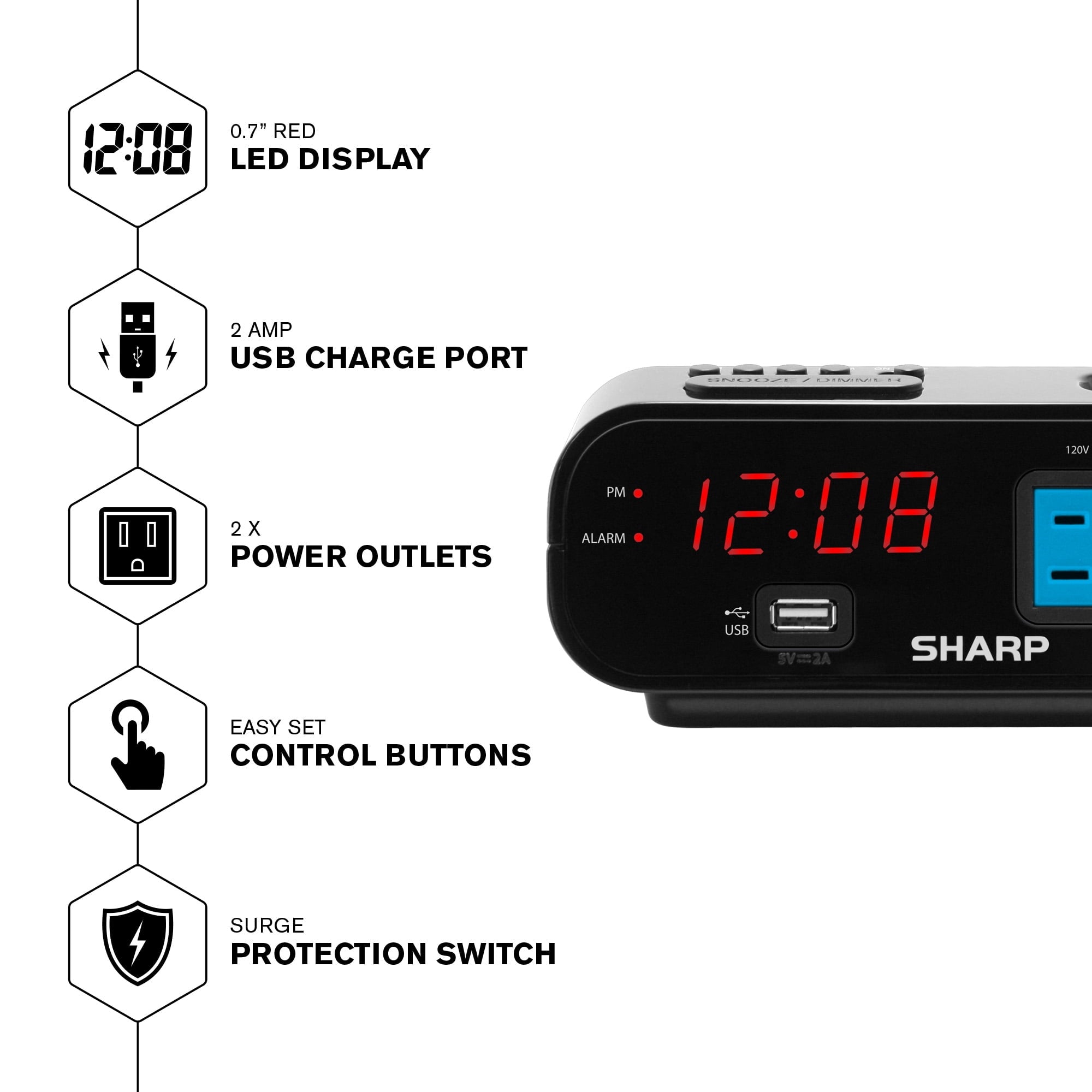 Minimize clutter on your nightstand with the Sharp Digital Alarm clock with 2 AMP USB port and 2 x AC Power Outlets. You can charge your smartphone and use the power outlets for low wattage items. The Surge Protect feature cuts off power to the AC outlets with the flick of a switch. The three step dimmer gives options to reduce the brightness.
