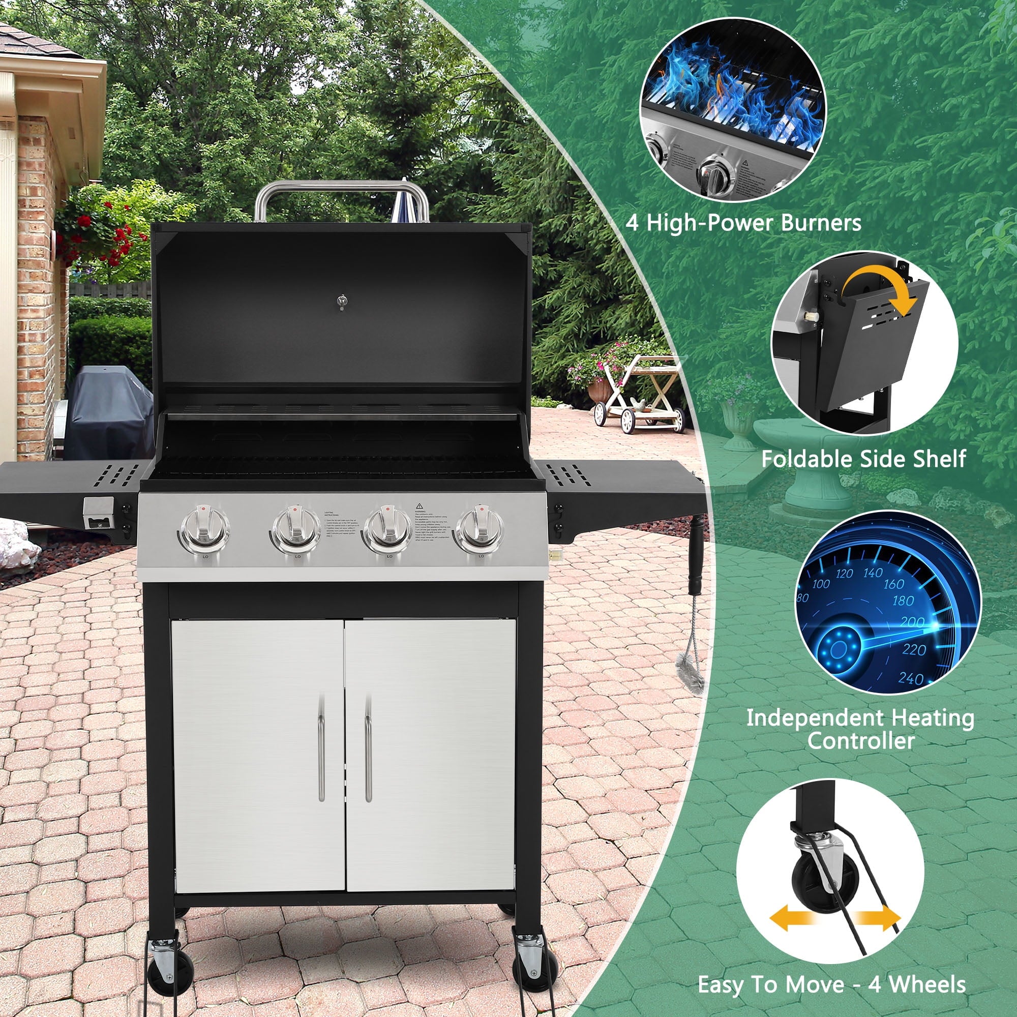 Home Outdoor Gas Grills 40000BTU Gas Gril with 4 Burners for Outdoor Cooking, Heavy Duty Propane Grill with 4 Universal Wheels & Bottle Opener, Stainless Steel BBQ Grill, Sliver&Black