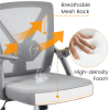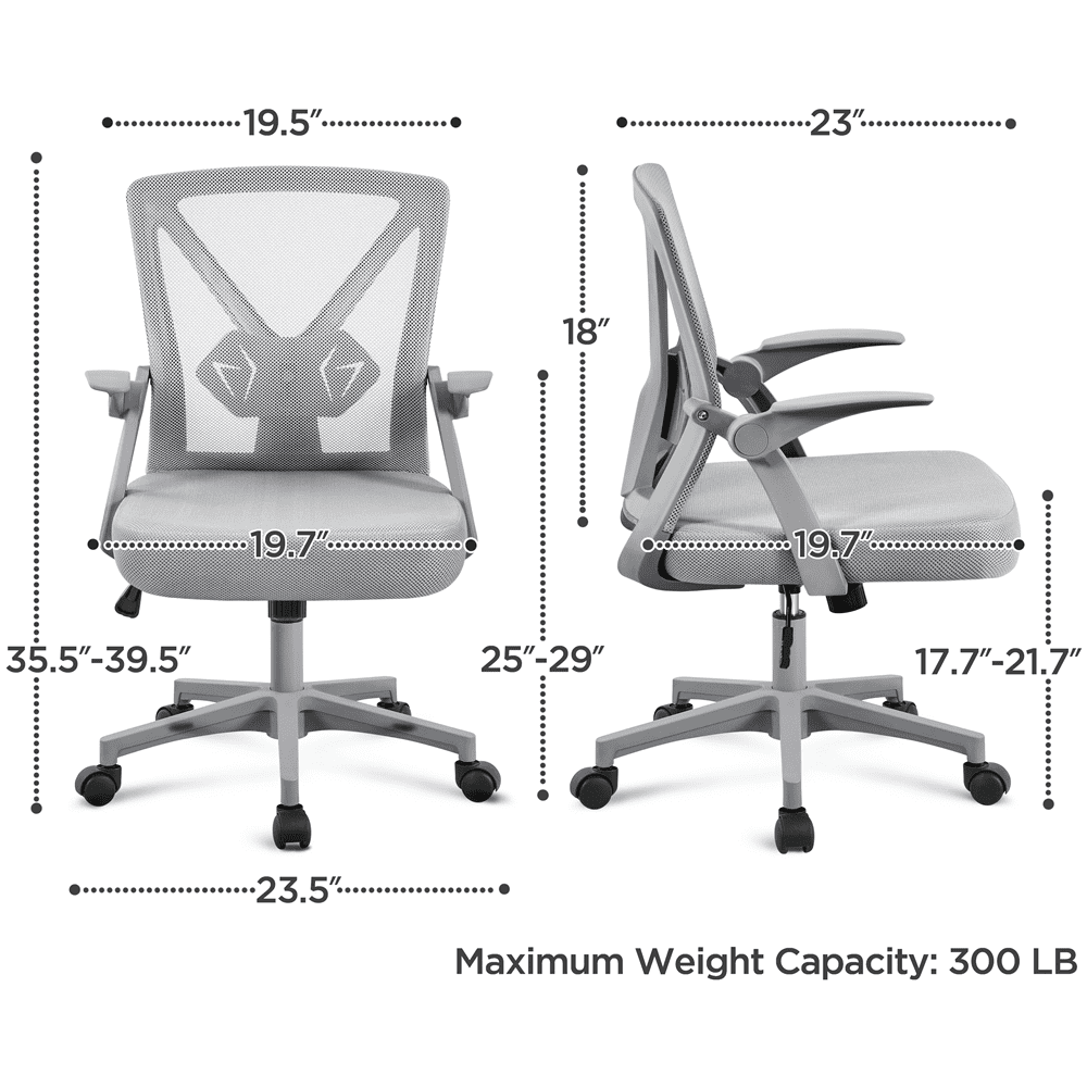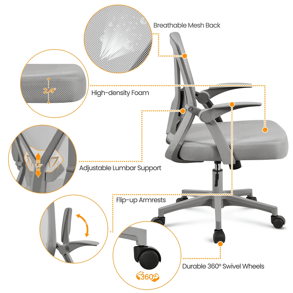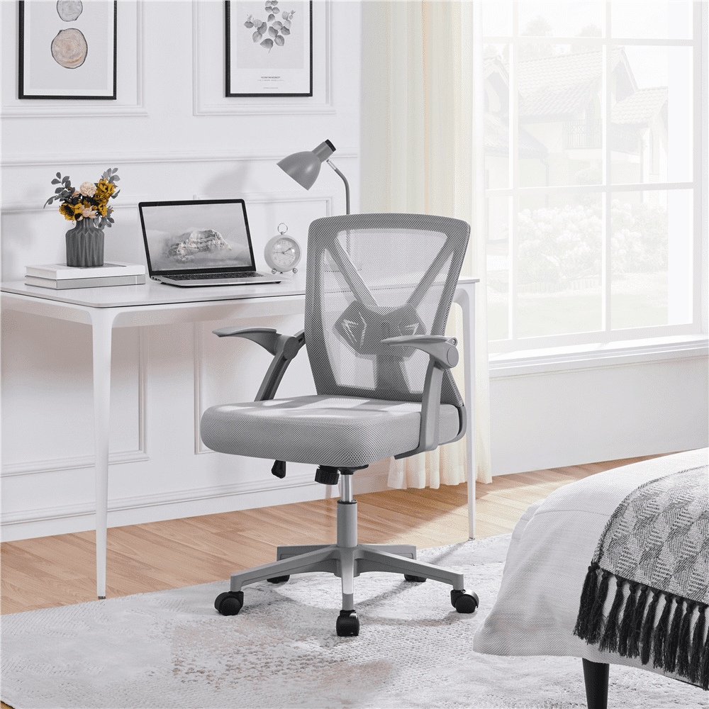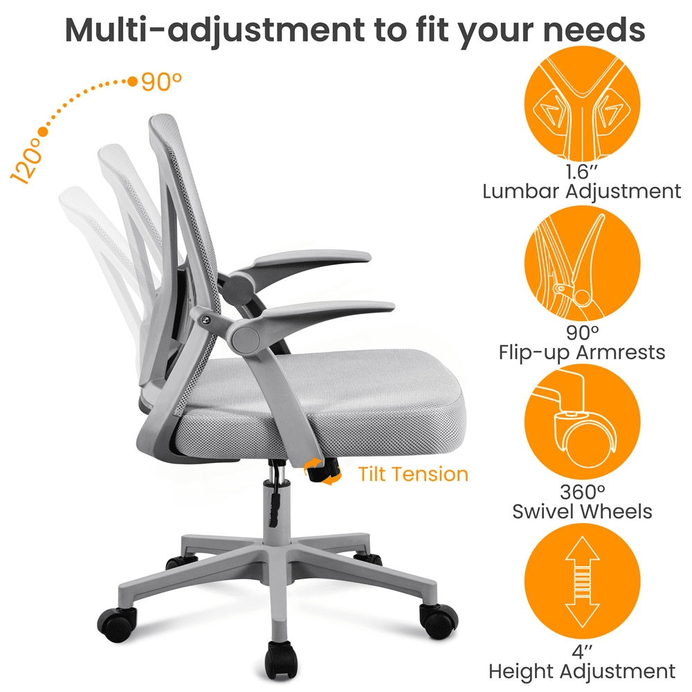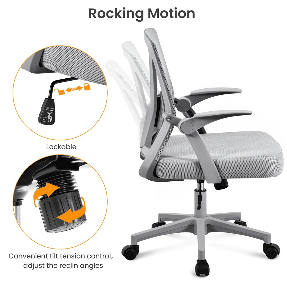Check out this great home office chair with a customized design to suit a variety of needs. The s-shaped mesh back gives full support to your back and lumbar while keeping you cool and dry. A large, cushioned seat relieves fatigue from prolonged sitting. Best of all, our desk chair is highly adaptable to your preferences. The seat and lumbar support can be adjusted within a certain range of heights to accommodate different body types. Armrests are a great place to rest your arms and can be flipped up to save a lot of floor space. The star base with five nylon castors allows 360° smooth and mute mobility. To add more fun, users can adjust the tilted angle of the backrest to enjoy rocking back and forth. Boost your efficiency and creativity with this mesh office chair. Age group: adult