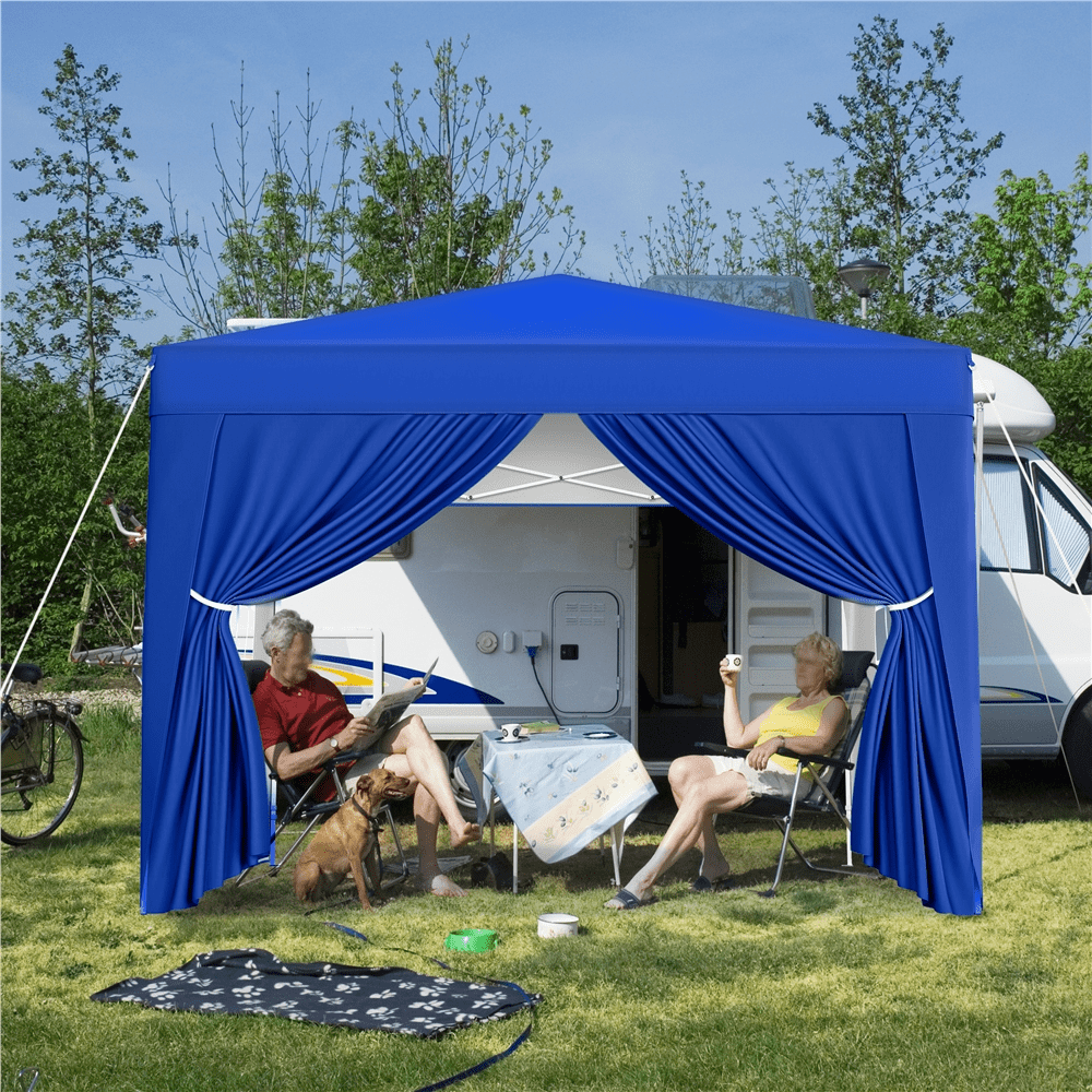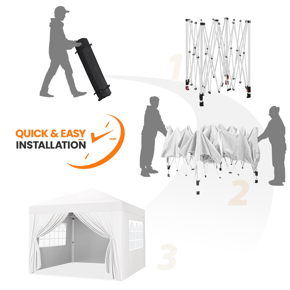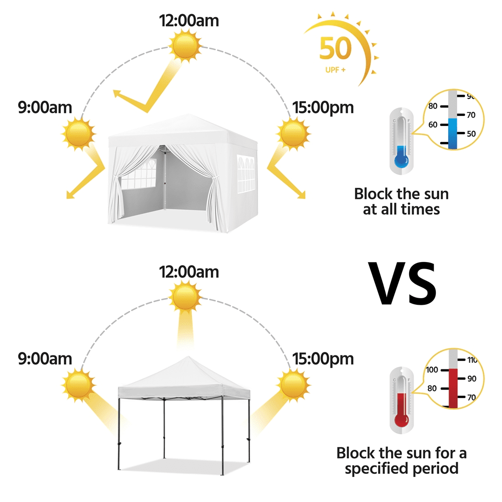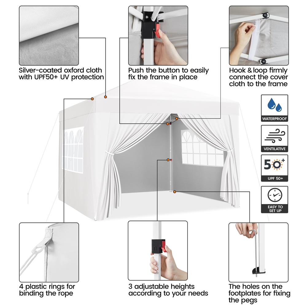 This camping canopy is made of plastic-coated iron and silver-costed oxford cloth. The 150D silver-coated canopy cloth has UPF 50+ UV protection. The durable surface material and sturdy metal frame ensure this canopy can work well for years.To prolong the service life of the canopy, we use a protective surface on the metal frame and oxford cloth. The metal iron is costed with plastic and the oxford cloth is coated with silver for better UV protection, which also gives better durability and stability.This outdoor canopy tent has three sidewalls and a door curtain, which provides great privacy protection. Two of the four sidewalls have windows to give you nice lighting.The whole height of this waterproof patio canopy is adjustable from 252cm/8.3ft to 272cm/9ft, with three different positions. You may press buttons to change the length of the tubes according to your needs. A zippered oxford cloth carrying bag is included, a good helper to well organize the canopy. The gazebo can be compact in this wheeled bag after being well folded, and you can take it with you for traveling or camping conveniently.