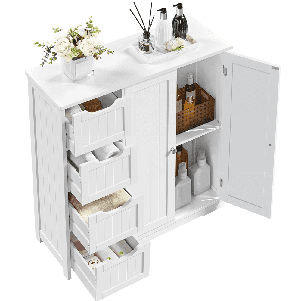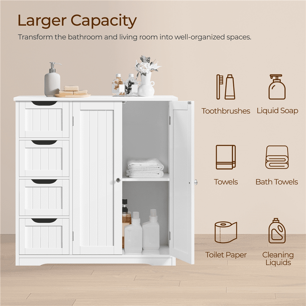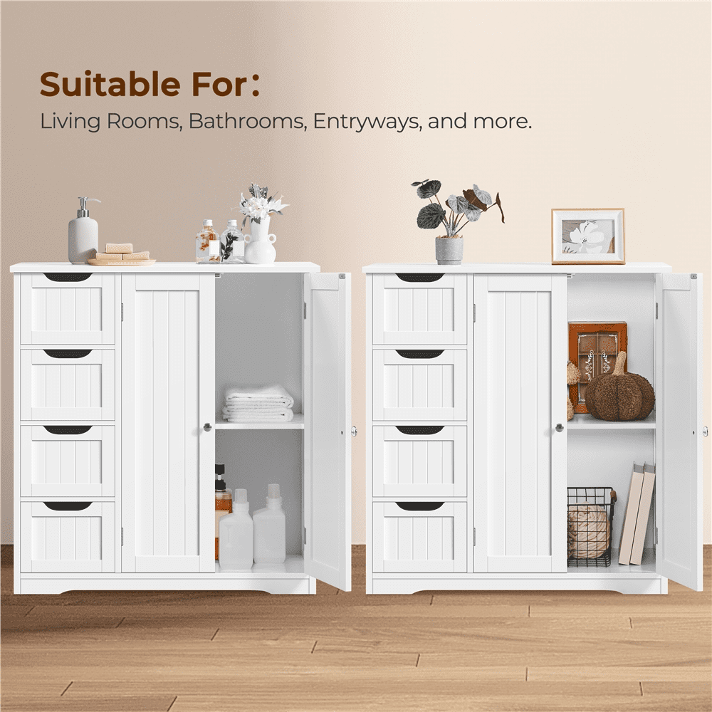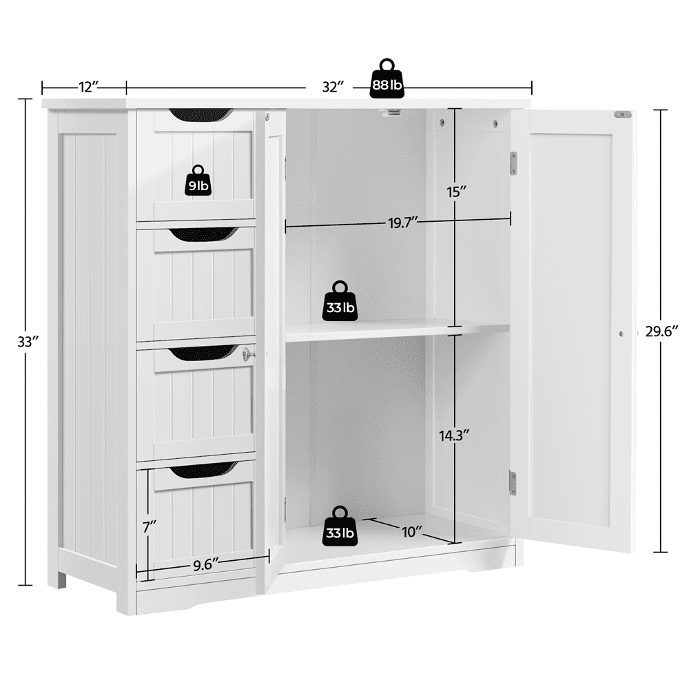 If extra toiletries and spare towels are piled up in your bathroom ensemble, having a spacious storage cabinet can help you hide all the clutter behind the door and out of sight. This 32″ L × 12″ W × 33″ H cabinet has 4 no-handle sliding drawers and 1 roomy cupboard with a fixed shelf, allowing you to keep items of different sizes behind the doors. Once you have it, the storage space in your bathroom, kitchen, and sitting room will instantly expand.