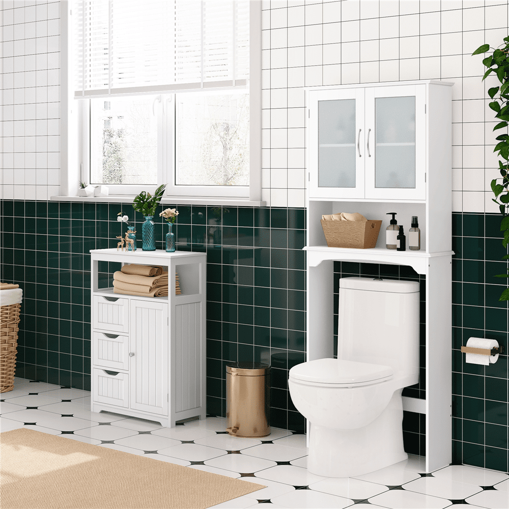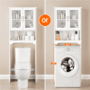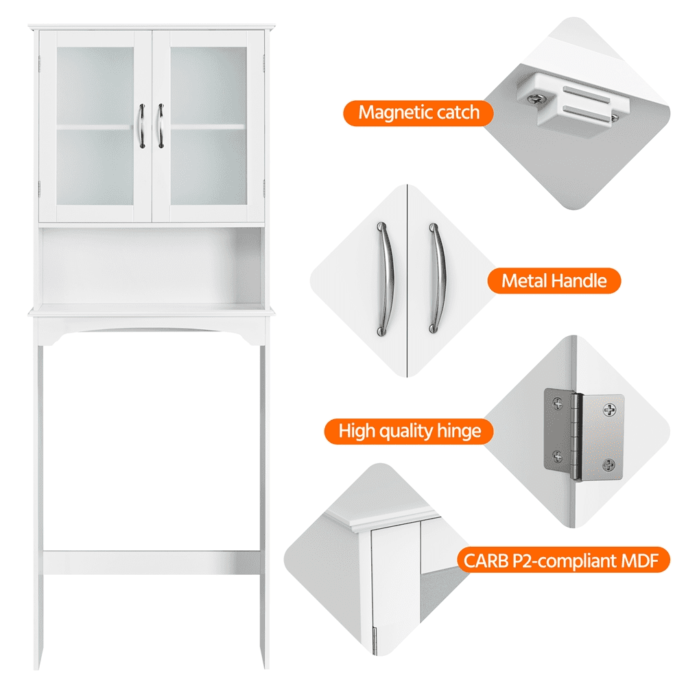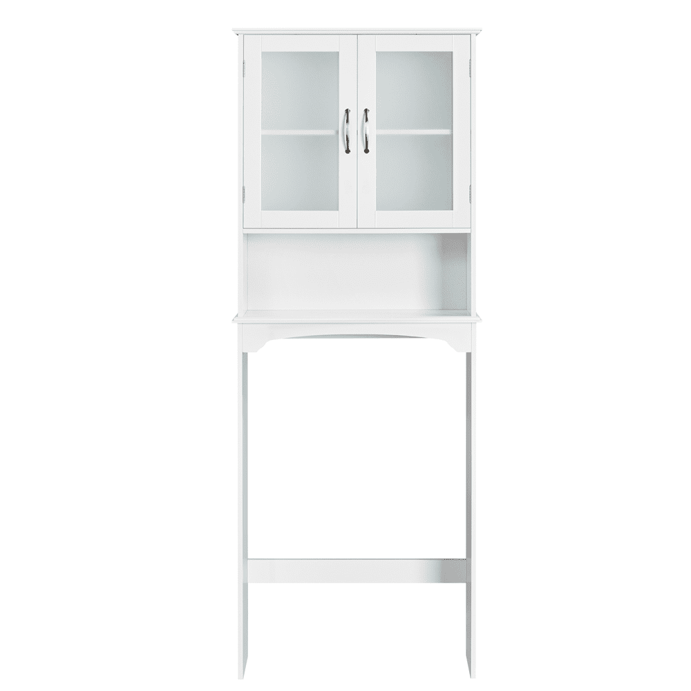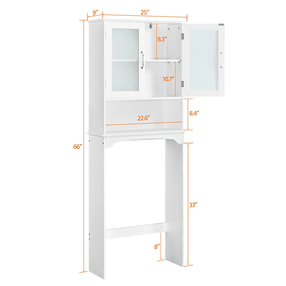 This versatile bathroom space saver features a two-door cabinet and an open shelf for easy access storage which allows you to utilize extra space for all your bathroom storage needs. This bathroom space saver features sturdy MDF construction, and its white finish ensures that it will match and accent any existing decor. An open shelf under the cabinet gives you an easy spot to keep your essentials organized and close by. It has four slim legs, so it can sit above your toilet for easy storage.