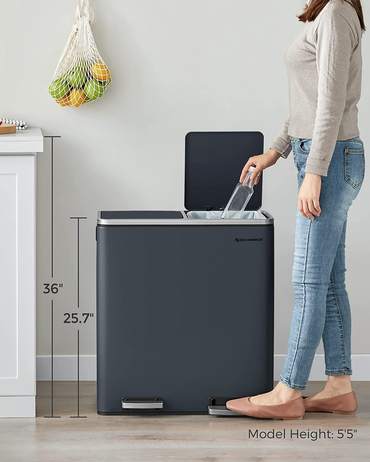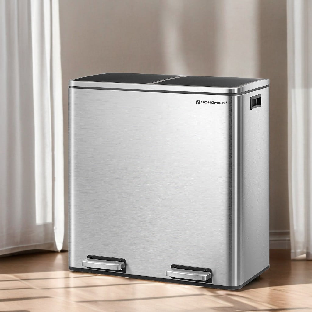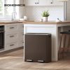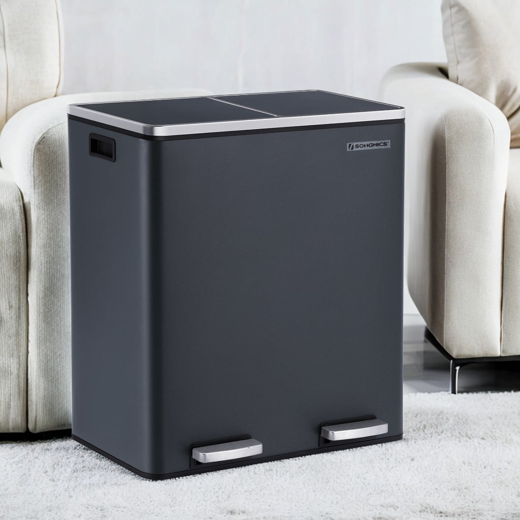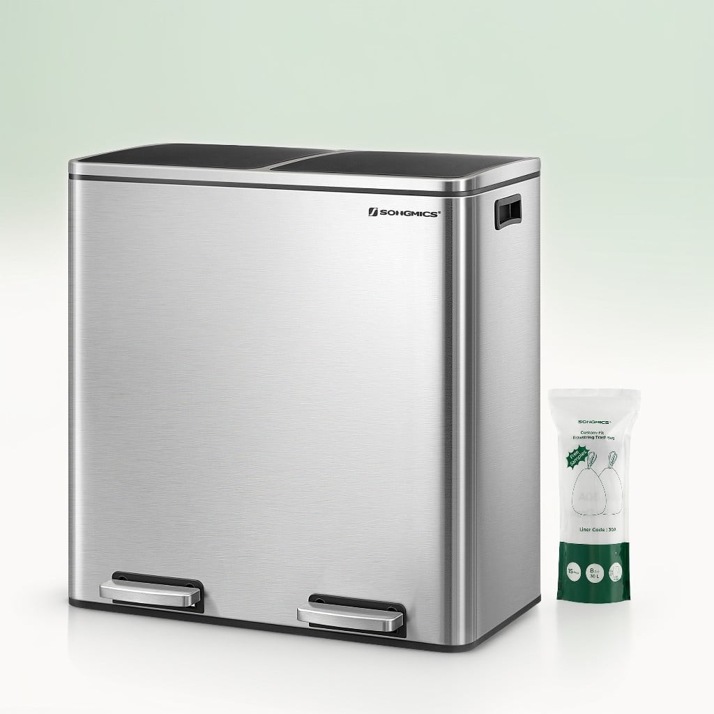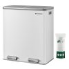 - [What You Get] A dual trash can sized at 23.2”L x 14.4”W x 25.6”H with 2 x 10.6-gallon compartments, 15 trash bags, plastic inner buckets, and a soft closure mechanism for easy waste disposal