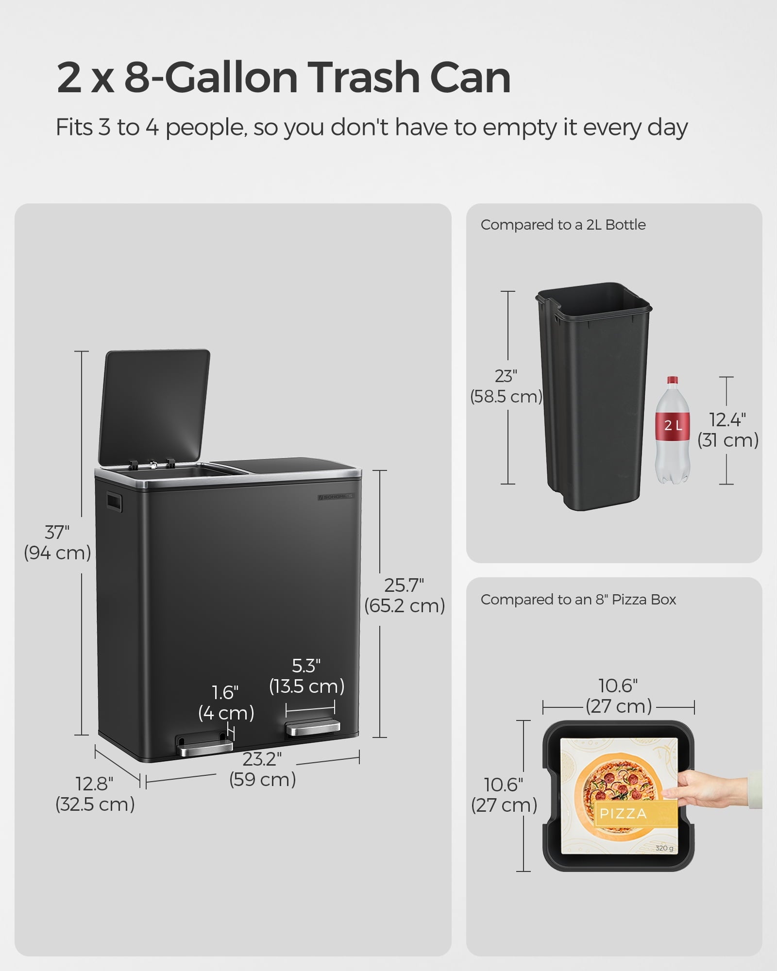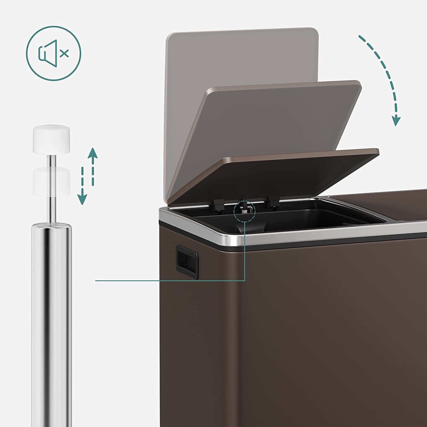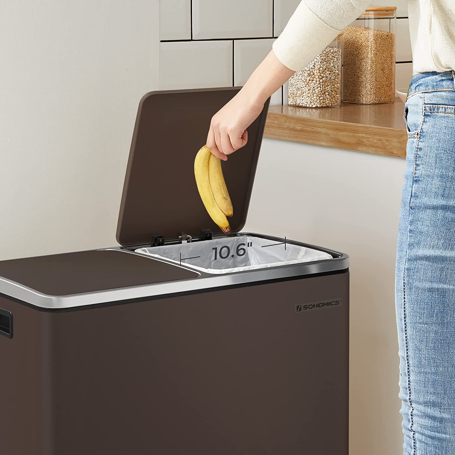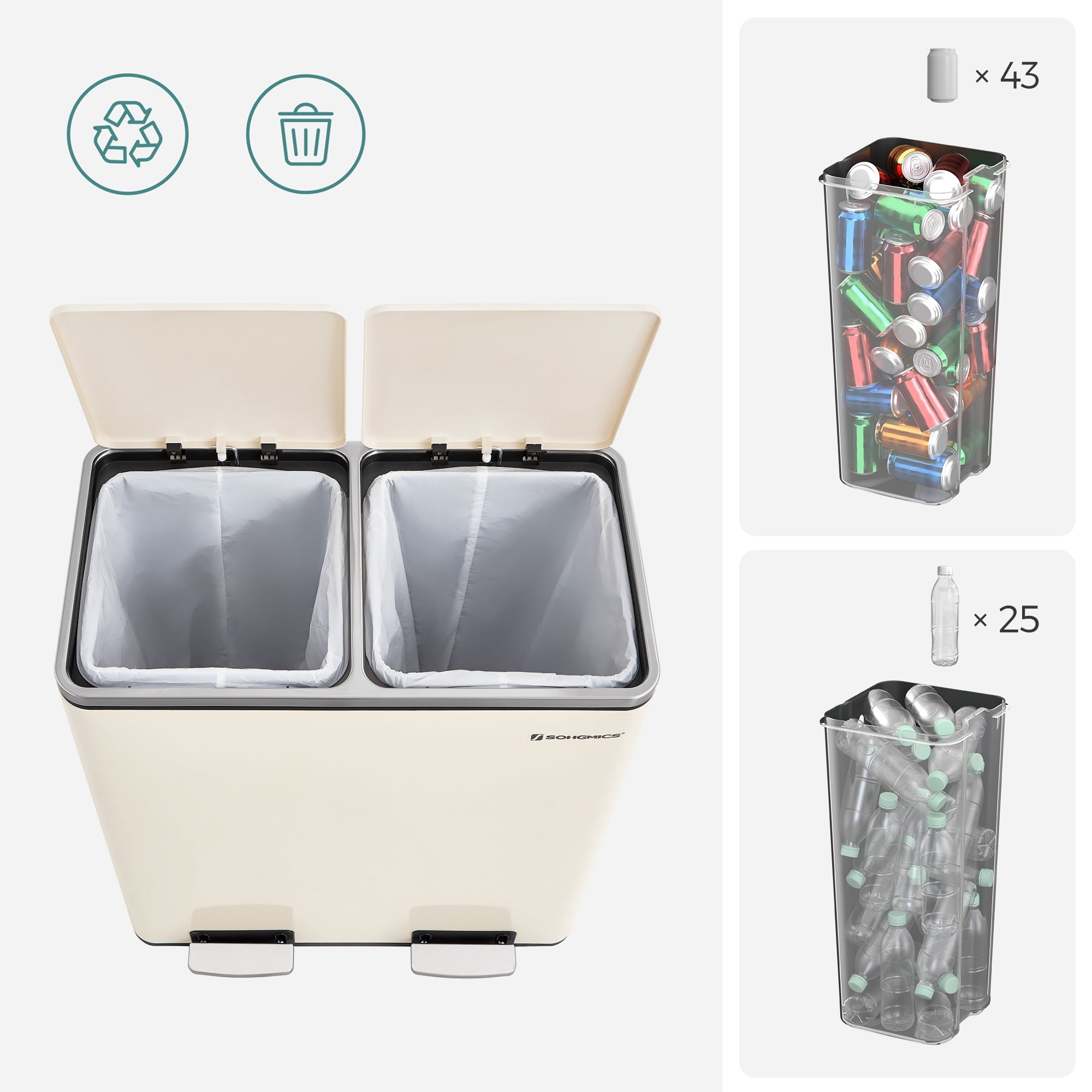 - [What You Get] A dual trash can sized at 23.2”L x 14.4”W x 25.6”H with 2 x 10.6-gallon compartments, 15 trash bags, plastic inner buckets, and a soft closure mechanism for easy waste disposal