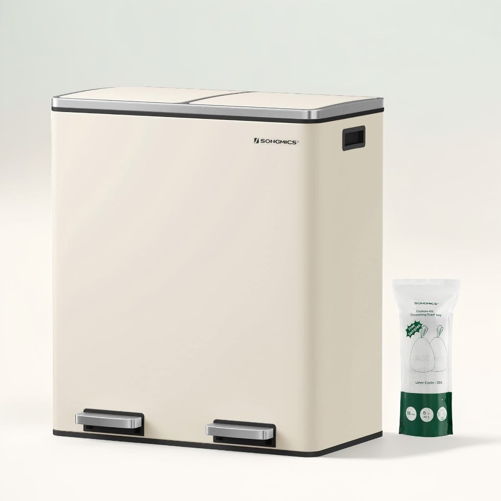 Enhance your kitchen with our stylish almond-colored trash can that combines functionality and design. Its simple silhouette makes it an eye-catching addition to any space. The hands-free pedal operation allows you to open the lid effortlessly, keeping your hands free while disposing of waste. Crafted from durable stainless steel, this trash can is built to last, and the soft-close lid ensures quiet operation without loud slamming. It includes two removable buckets with inner handles for easy cleaning in case of spills. Measuring 23.2”L x 14.4”W x 25.6”H, this dual trash can features 2 x 10.6-gallon compartments, comes with 15 trash bags, and incorporates a soft closure mechanism for convenient waste disposal.