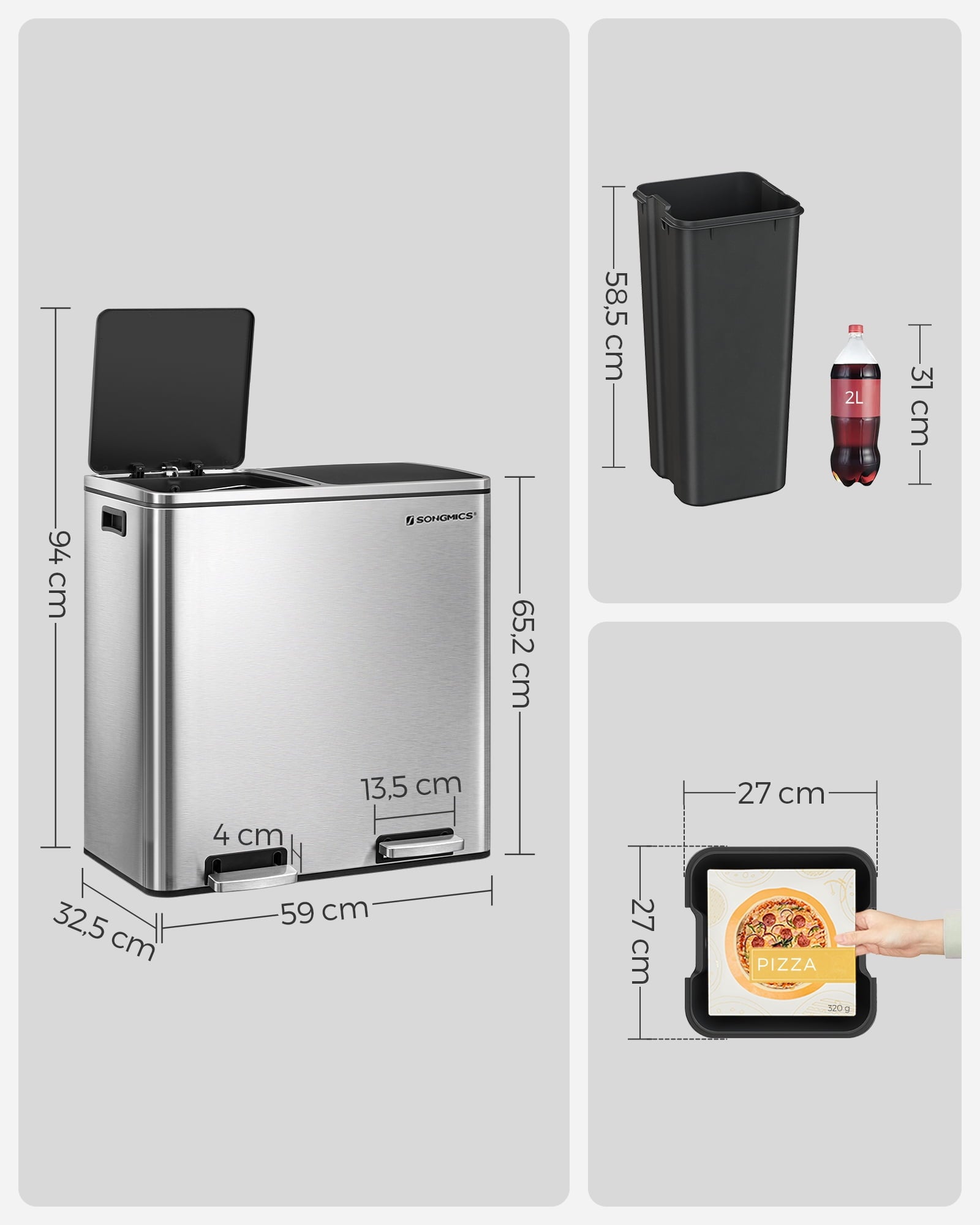 - Material: Stainless Steel Bin, PP Plastic Inner Bucket, ABS Plastic Lid