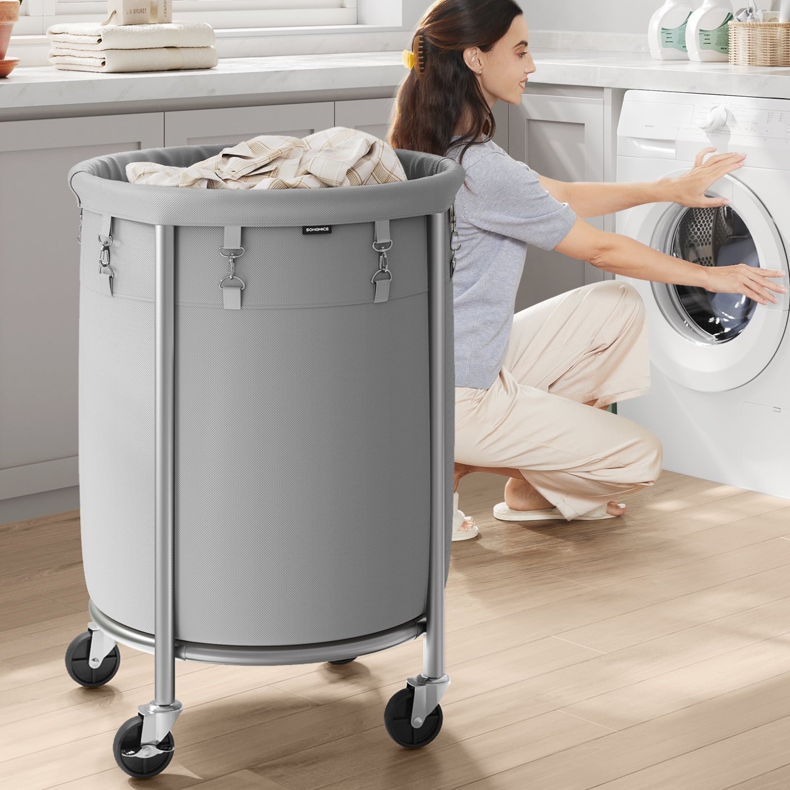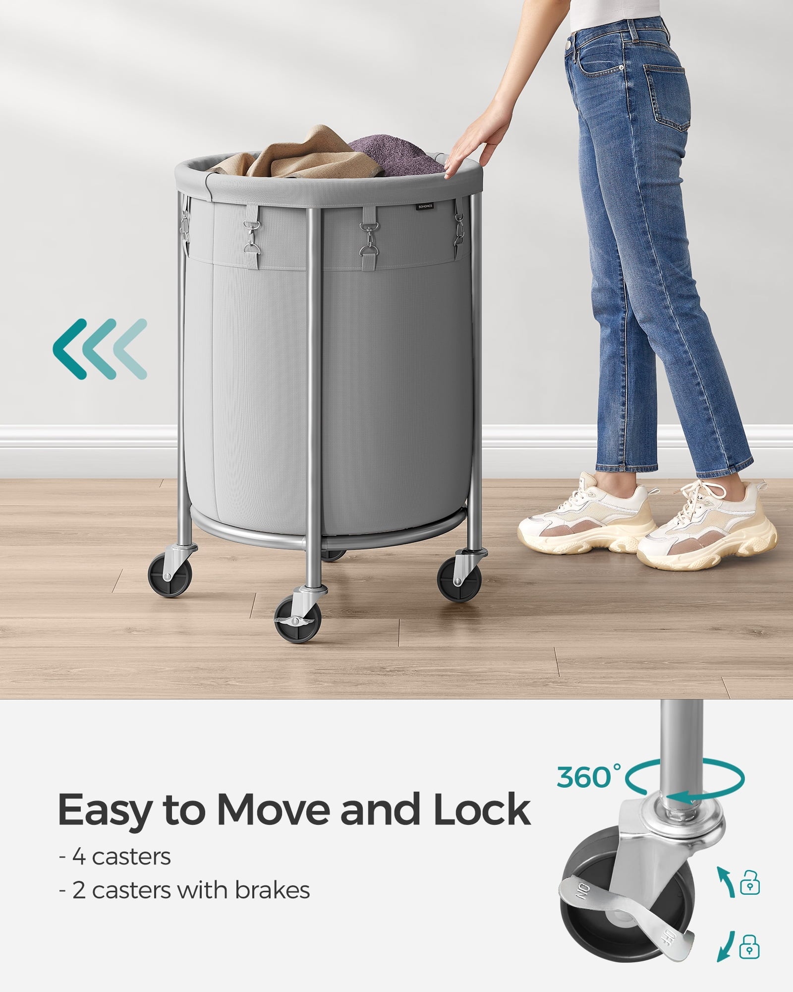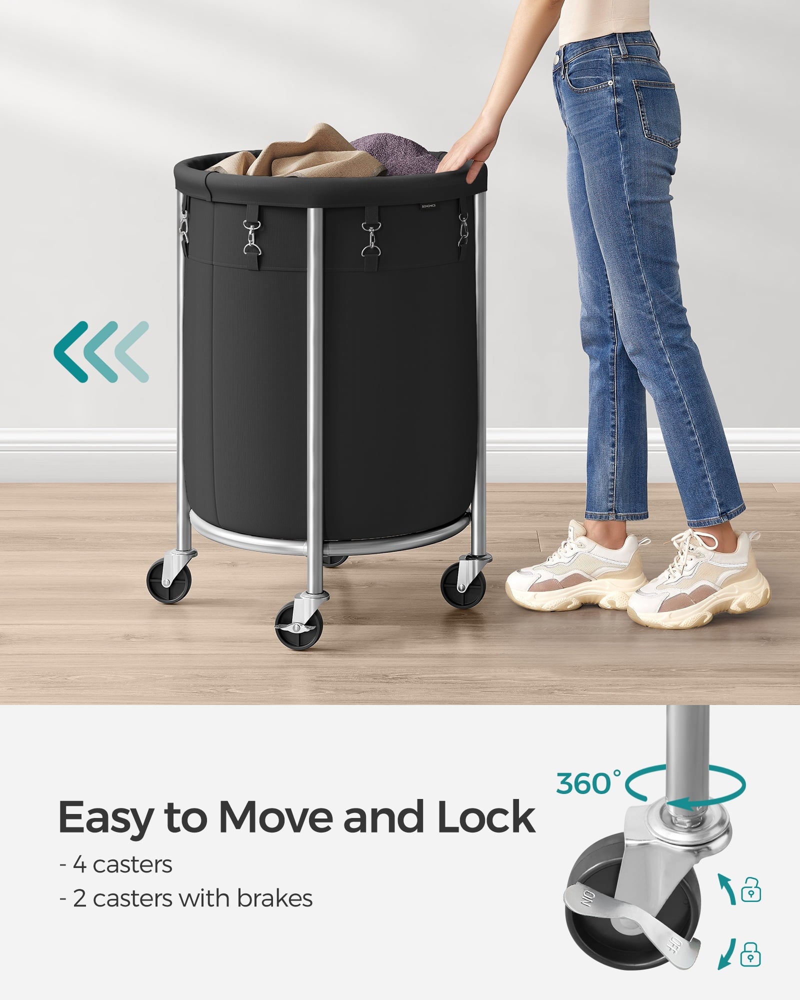 - 【Smooth to Move】 4 casters let the laundry sorter move freely, and you can easily push it from the bedroom to the laundry room; 2 lockable wheels help to place the rolling laundry basket wherever you need it. The heavy duty rubber material ensures that the wheels won’t scratch the floor or make any noise.