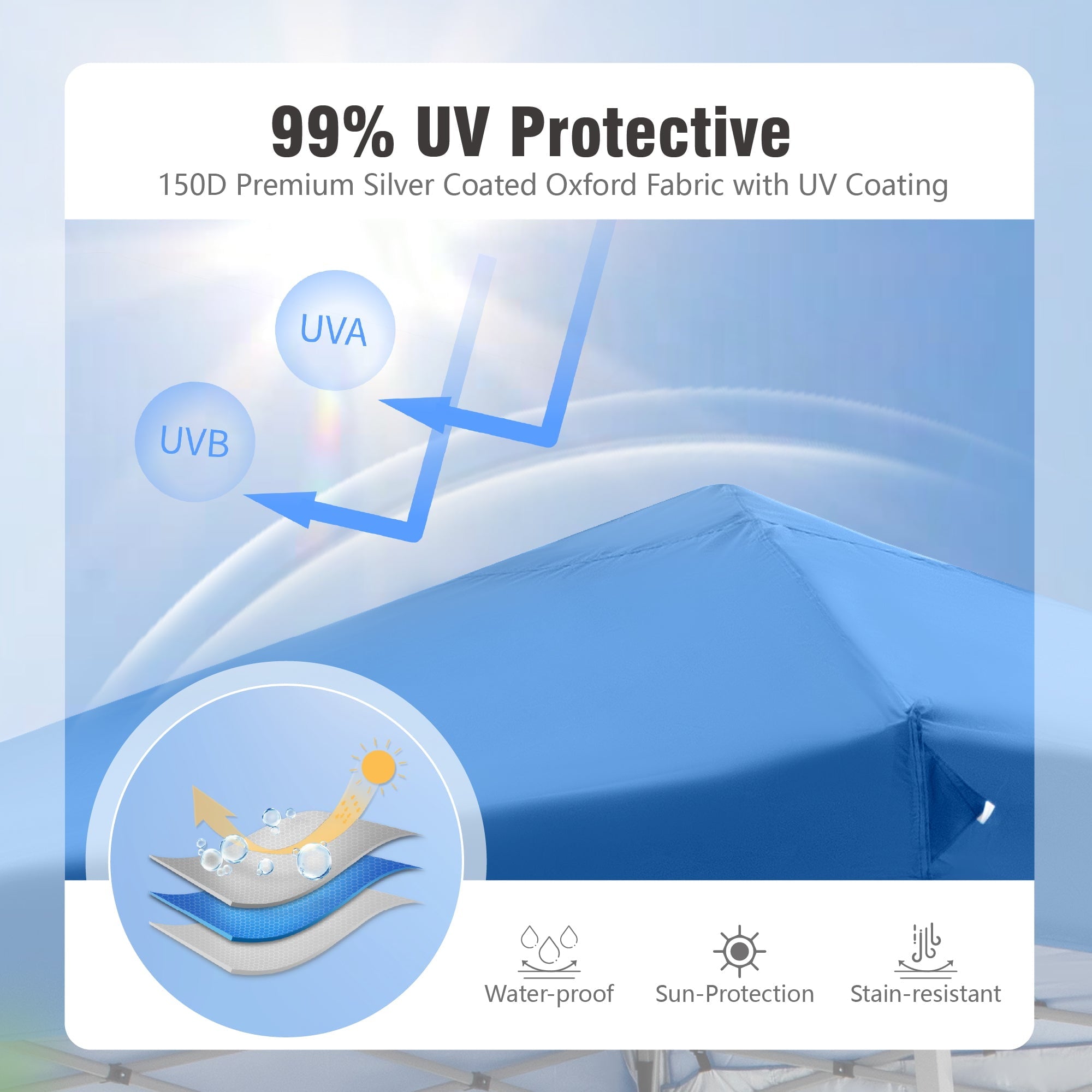 - High Quality Material: Our canopy is made of high quality 100% waterproof 150D Oxford awning with silver coating. Flame retardant in accordance with CPAI-84 standard.