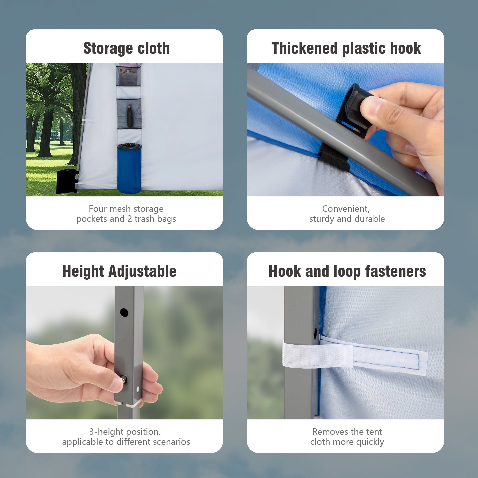 - Height adjustable: The canopy can be adjusted to three different heights as needed. There are pinch-free buttons on each leg. Powder coated steel frames provide maximum strength and durability.