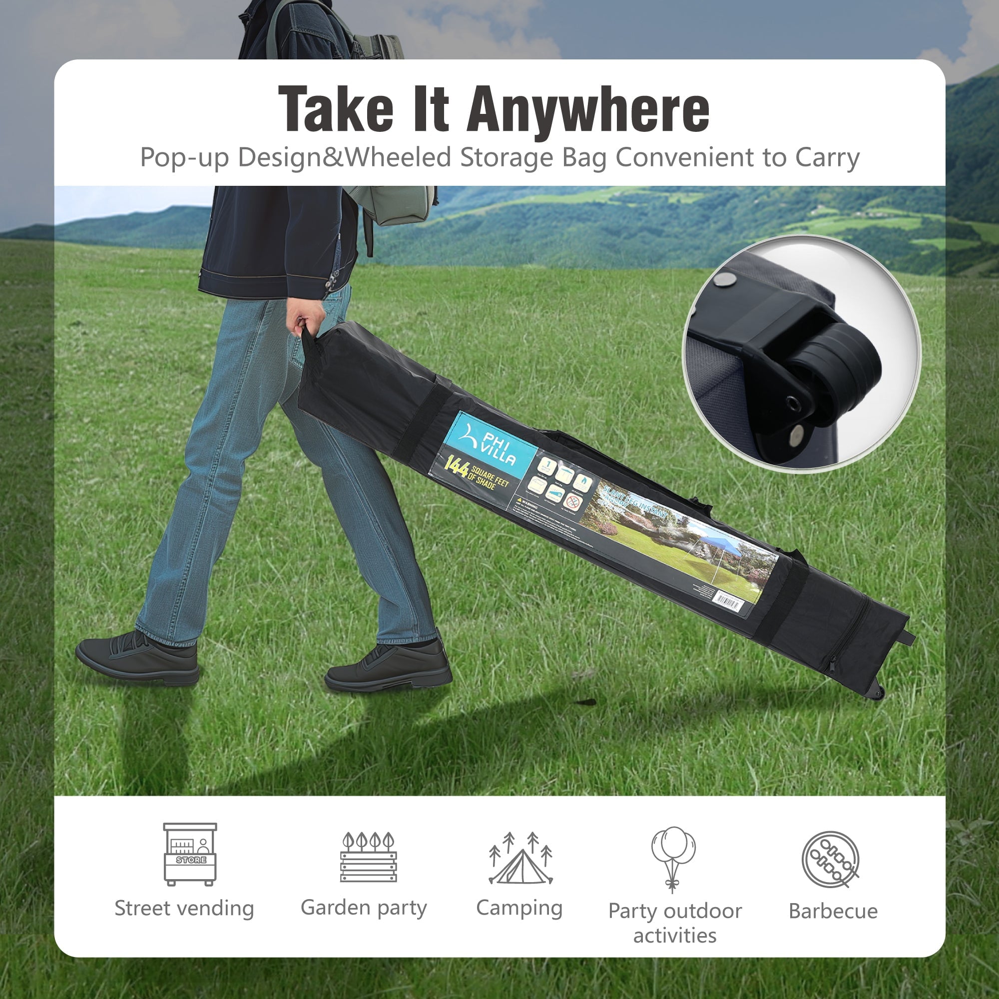 Whether you’re hosting a barbecue, attending a sporting event or spending a day at the beach, you’ll be able to take our 12′ x 12′ Pop-up Canopy Gazebo Tent anywhere. Our tent can conveniently and flexibly decorate gardens, balconies, swimming pools, barbecue areas and other outdoor venues. When you camping or backyard gathering, you can block the sunshine and give you a happy time. Our tent is easy to carry, durable and practical.