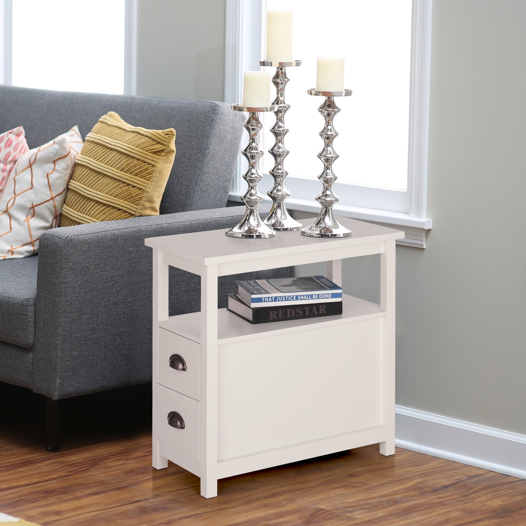 This end table is suitable for limited space in your room. Made of MDF material, our side table has a solid frame structure to ensure durability and large weight capacity. The wide tabletop offers spacious space to hold your items. Meanwhile, the drawer and lower shelf provides you privacy and open space to organize various objects neatly. Equipped with exquisite handle, the stylish side table adds a unique touch and matches any home decoration. This space-saving table is ideal for limited space as side table, nightstand, or coffee table in anywhere you need. It is a quite good choice for you. Please don’t hesitate to buy it.