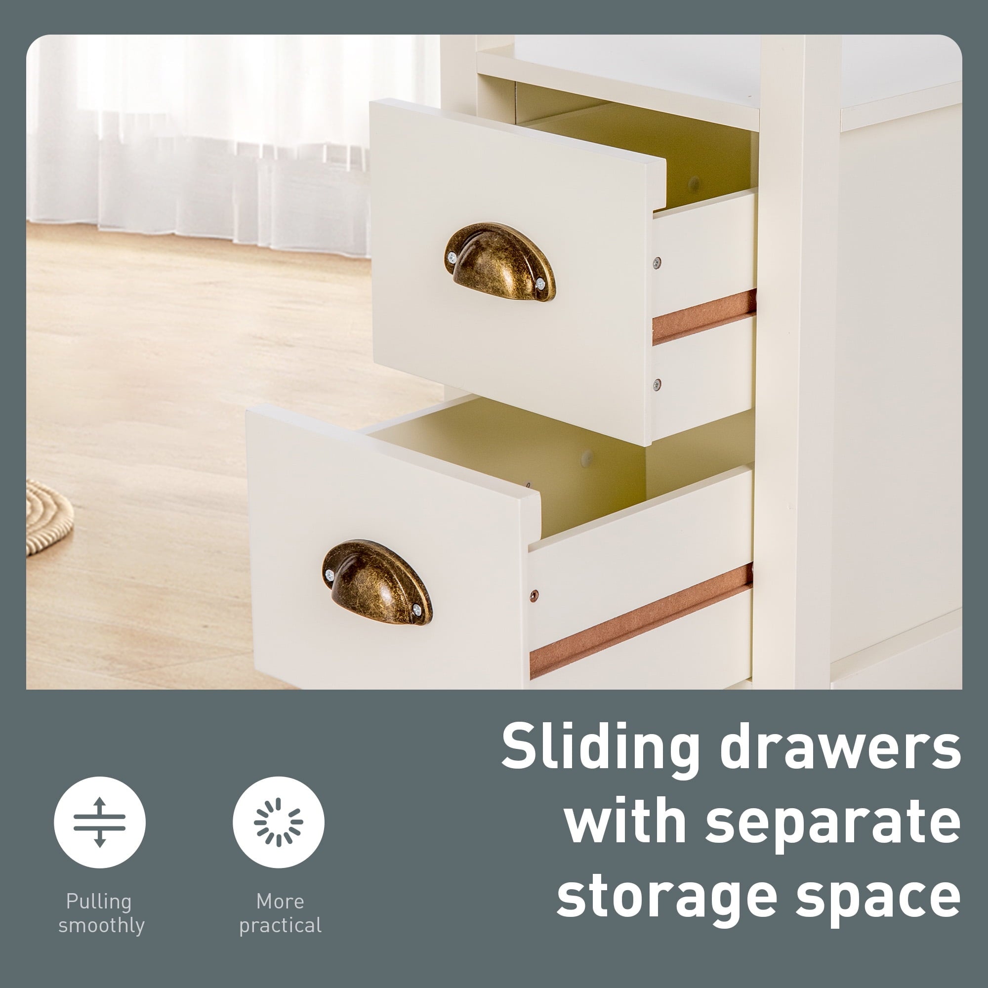 - 2 Sliding Drawers: Features two drawers, which offer additional storage space for placing and displaying your stuff. Smooth sliding track and slot.