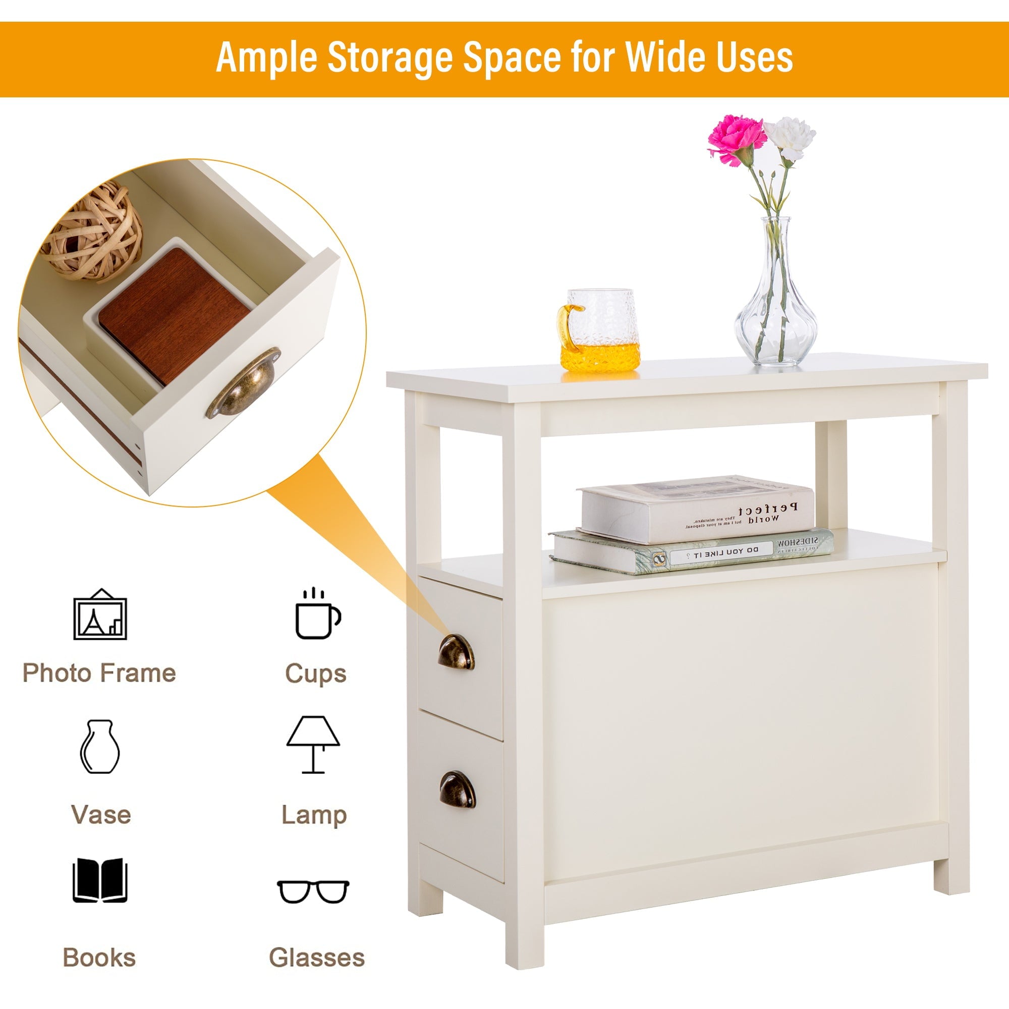 - Multiple Usage: This nightstand can be used for storing small things like alarm, table lamp, phone and more by your bedside, so that everything you need is at your fingertips. The small side table also can be used in the living room to display your family photos and handicrafts.