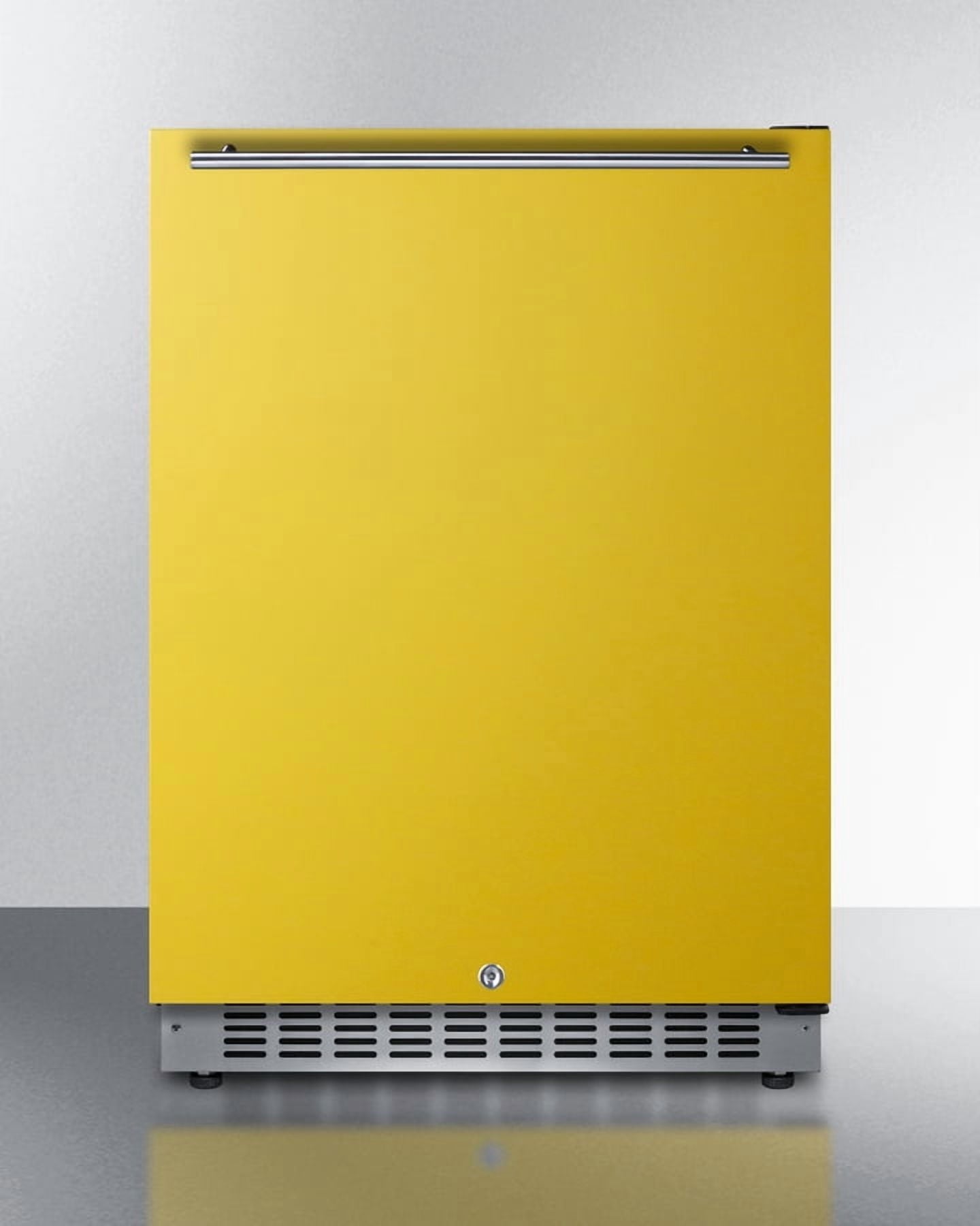 Make a statement under the counter with Summit’s exclusive collection of boldly colored refrigerators and matching freezers.Model AL54Y is a 24″ wide refrigerator sized at just 32″ high for easy installation under lower ADA compliant counters. The front-breathing cooling system allows built-in use, while the fully finished black cabinet also enables freestanding applications. The door comes in a bright saffron gold hue, with a sleek horizontally mounted stainless steel handle and matching stainless steel kickplate to complete the unique look. Inside, the AL54Y utilizes frost-free operation with fan-forced cooling to ensure low maintenance and even temperature distribution. Recessed LED lighting offers an attractive yet efficient look. The digital thermostat makes it easy to manage the interior temperature. This unit includes adjustable glass shelves for flexible, spill-proof storage and two large door racks ideal for keeping condiments in easy reach. The floor is specially slotted to hold bottles in place. An open door alarm and high temperature alarm audibly warn if stored items are being exposed. An optional Sabbath mode setting lets you disable some of the electrical elements during periods of observance.Additional features include a factory-installed lock for optional security, user-reversible door swing to best fit your space, right angle plug to save on depth, and sealed rear to ensure easier cleaning. The AL54Y can be paired with the ALFZ53B frost-free freezer to create a matching undercounter ADA compliant set. Additional colors are available, including cobalt blue, emerald green, and lavender. Browse the full Summit selection to find the perfect addition to your kitchen.