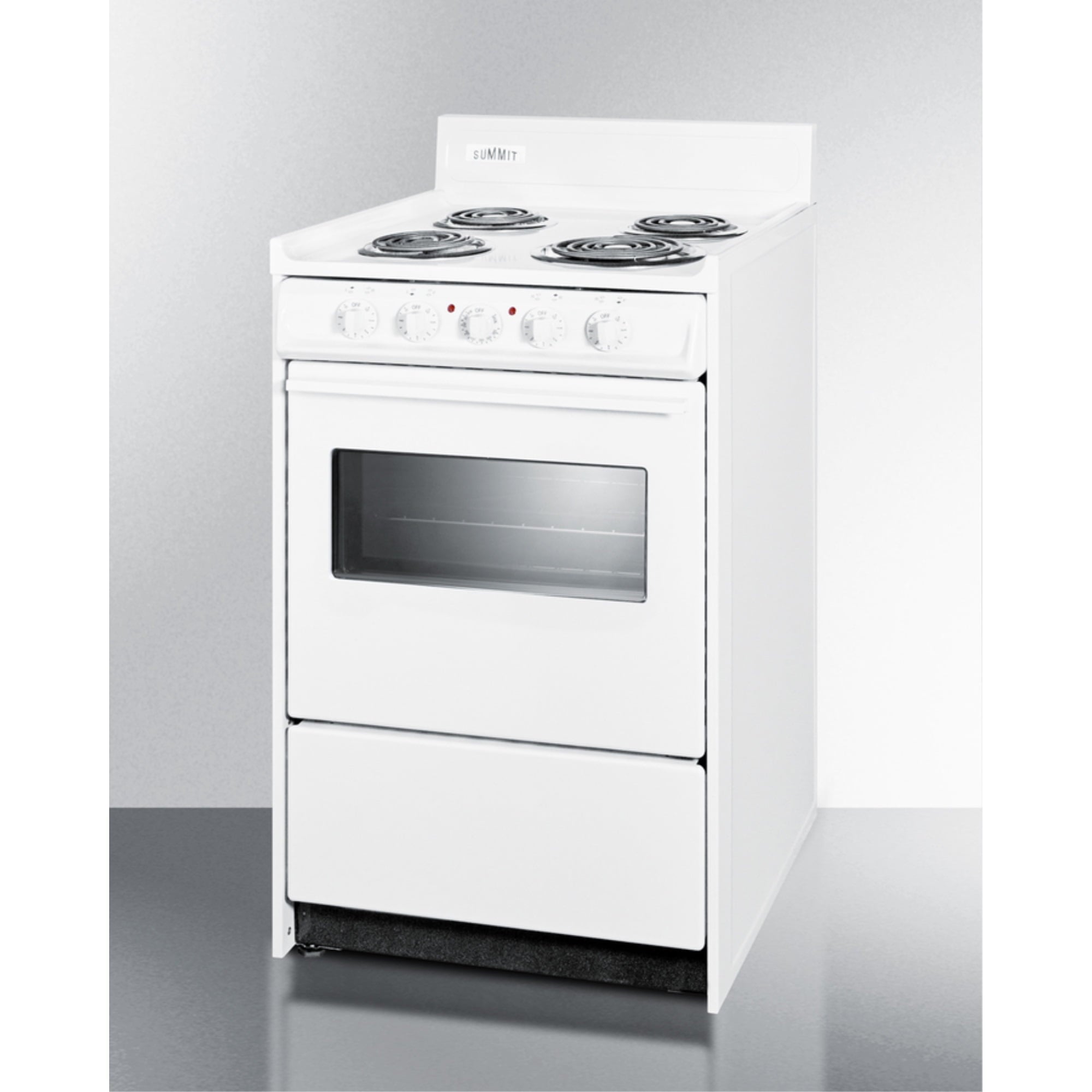 Summit Appliance offers a wide selection of American-made household ranges built for long-lasting durability in space-challenged kitchens. The WEM110W is an apartment-sized 220V electric range sized at just 20″ wide, with a generous 2.46 cu.ft oven interior that can accommodate large trays. The oven window and interior light with an on/off switch make it easy to monitor your cooking without opening the door. Two adjustable oven racks are included. The waist-high broiler is located inside the oven, allowing you to switch functions without moving contents to a separate compartment on the floor. The lower drop-down storage compartment is ideal for keeping pots and pans out of the way in small kitchens. Designed to meet the most current UL safety standards, this unit features one 8″ 950W and three 6″ 650W coil elements. These operate at lower wattage than standard electric ranges, allowing for a slow but steady heating process that will not cycle off. Upfront push-to-turn knobs offer additional protection, ensuring users won’t reach over hot burners to adjust the heat. This unit complies with ADA guidelines. The WEM110W comes in a classic white finish to suit any kitchen. It has a recessed oven door and is conveniently sized at just 24″ deep for a better fit in galley in L-shaped kitchens, where every inch counts. Porcelain and steel construction help the unit hold up to years of daily use. We include an anti-tip bracket for added safety. This unit does not include a line cord (a standard 40 amp 3 or 4-prong cord can be installed by your electrician). With its classic style and quality construction, Summit’s made in the USA cooking line offers reliable cooking for smaller homes.