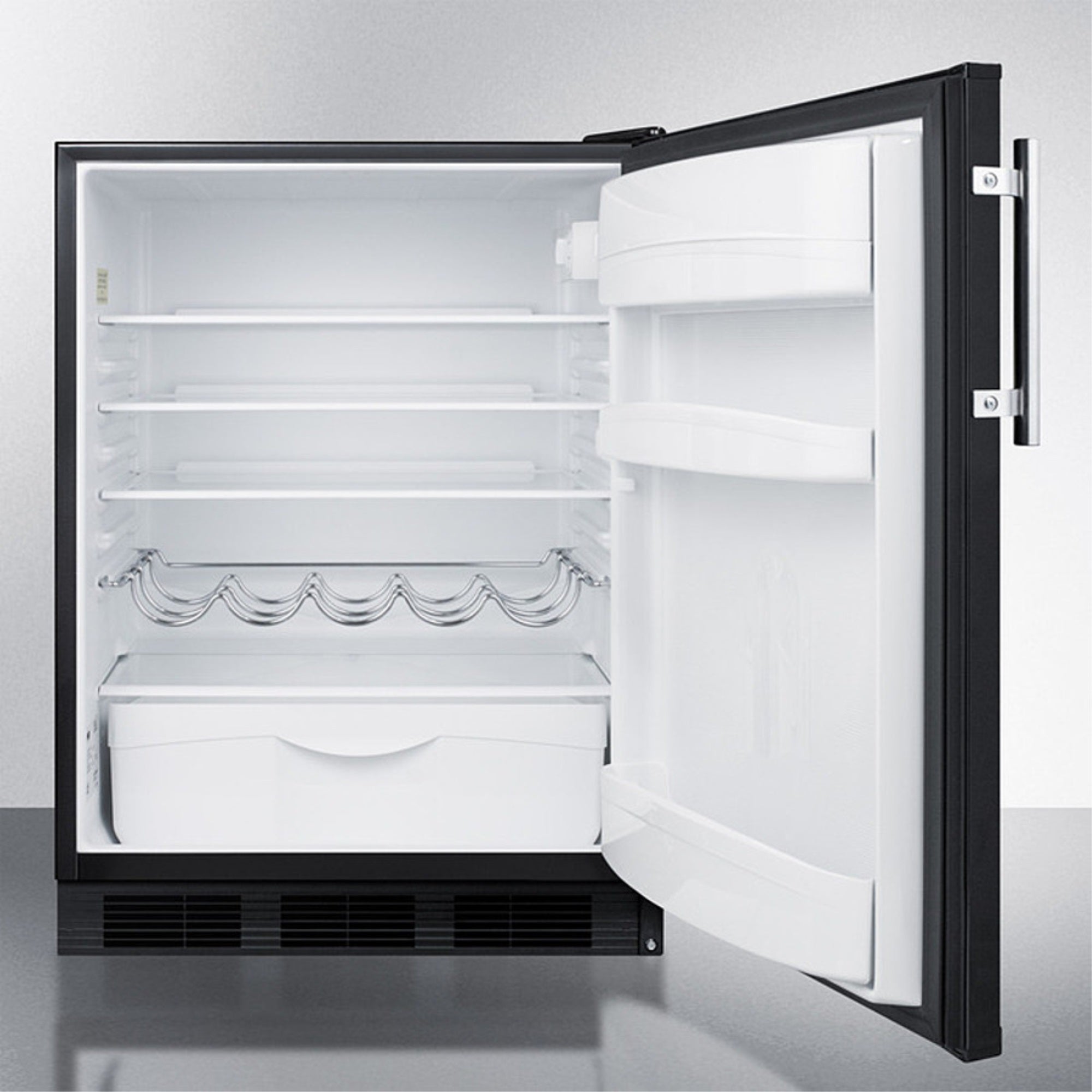 SUMMIT offers the industrys largest selection of counter height refrigeration , with a range of choices to best suit any kitchen. The FF63B Series includes European made all-refrigerators designed for freestanding use in residential settings. Sized with a 24″ footprint, the FF63BK all-refrigerator is designed for freestanding use. It comes in a classic black finish with a user-reversible door swing and attractive stainless steel handle. Inside, the FF63BK utilizes automatic defrost operation to ensure minimum user maintenance. The 5.5 cu.ft. interior offers more storage space than most models in this size class. Adjustable glass shelves ensure spill-proof storage, while a large crisper drawer is ideal for keeping produce at its best. A removable wine shelf lets you keep bottles securely in place. The door includes three storage racks for condiments and tall bottles. The seamless interior also features a dial thermostat and automatic light. Designed and constructed in Europe, the FF63BK brings reliable cold storage to any home setting. For a built-in version of this model, see the FF63BKBI.