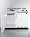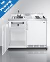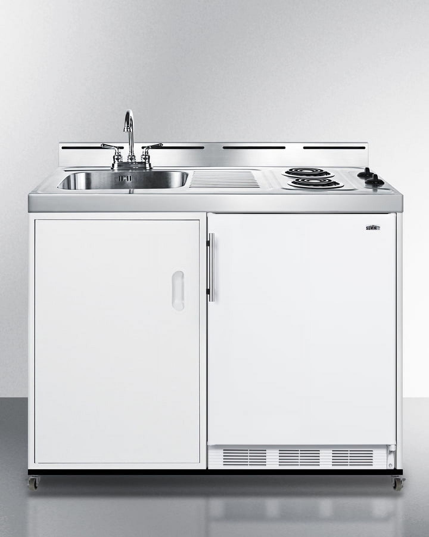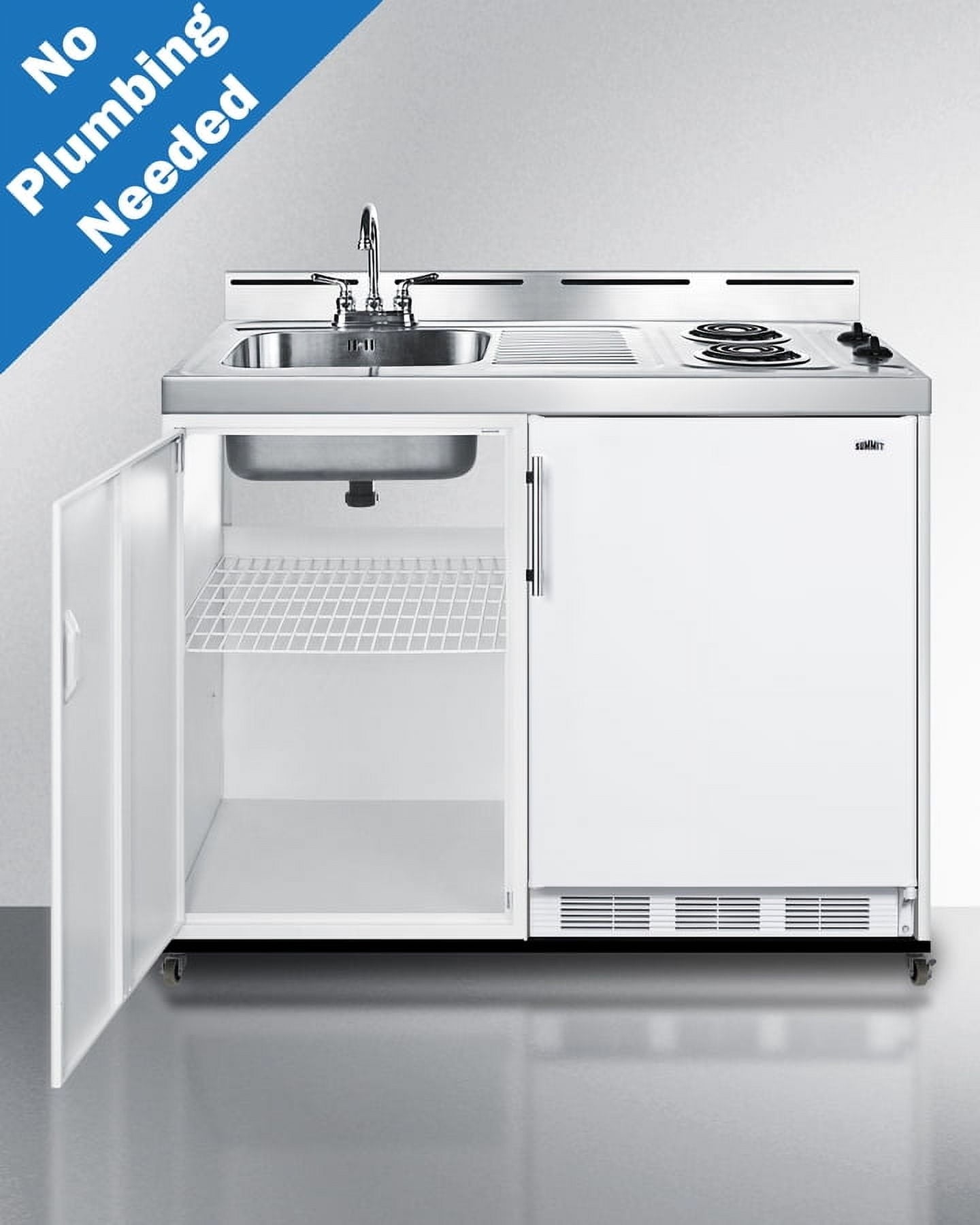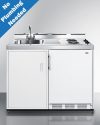 Summit brings innovation and convenience to non-traditional kitchen spaces with a new line of all-in-one kitchenettes designed for portable use in settings without standard water lines. Great for efficiency housing, off-grid living, and temporary or basement kitchens, the C48ELPUMPMB is a mobile 48 inch wide kitchenette composed of a refrigerator-freezer, 2-burner coil cooktop, sink, and storage cabinet that can be used as a portable water station. We include CKPUMPKIT, a package that features everything you need to connect the sink to a removable 5 gallon water jug to pump your fresh water through the included faucet. The kit comes with a 5 gallon jug, 6 gallon waste water container, 110V water pump, and all of the hardware and tubing you need to install your own “no plumbing” sink. The C48ELPUMPMB features two 115V coil elements for convenient stovetop heating. The cooktop includes its own pre-installed 3-prong cord for easy setup. It ships with our popular CT661W European refrigerator-freezer, offering 5.1 cu.ft. of storage capacity with adjustable glass shelves, door racks, a scalloped steel wine shelf, and large crisper drawer ideal for keeping produce at its best. Sized just under 48 inches wide, the C48ELPUMPMB comes in a shallow 24 inch depth ideal for smaller kitchens. Factory-installed casters allow you to smoothly move the unit as needed, with the front two casters equipped with locks to stay in place. This unit features a classic white cabinet finish with a durable stainless steel work surface and backguard. For more storage options, add our APSS48 appliance station shelf or our selection of wall cabinets. This unit ships on one pallet in three overboxed packages (kitchenette, refrigerator, and pump kit). Just slide the refrigerator in, install the pump kit, plug in the appliances, and enjoy your fully functional efficiency kitchen with no plumbing required!