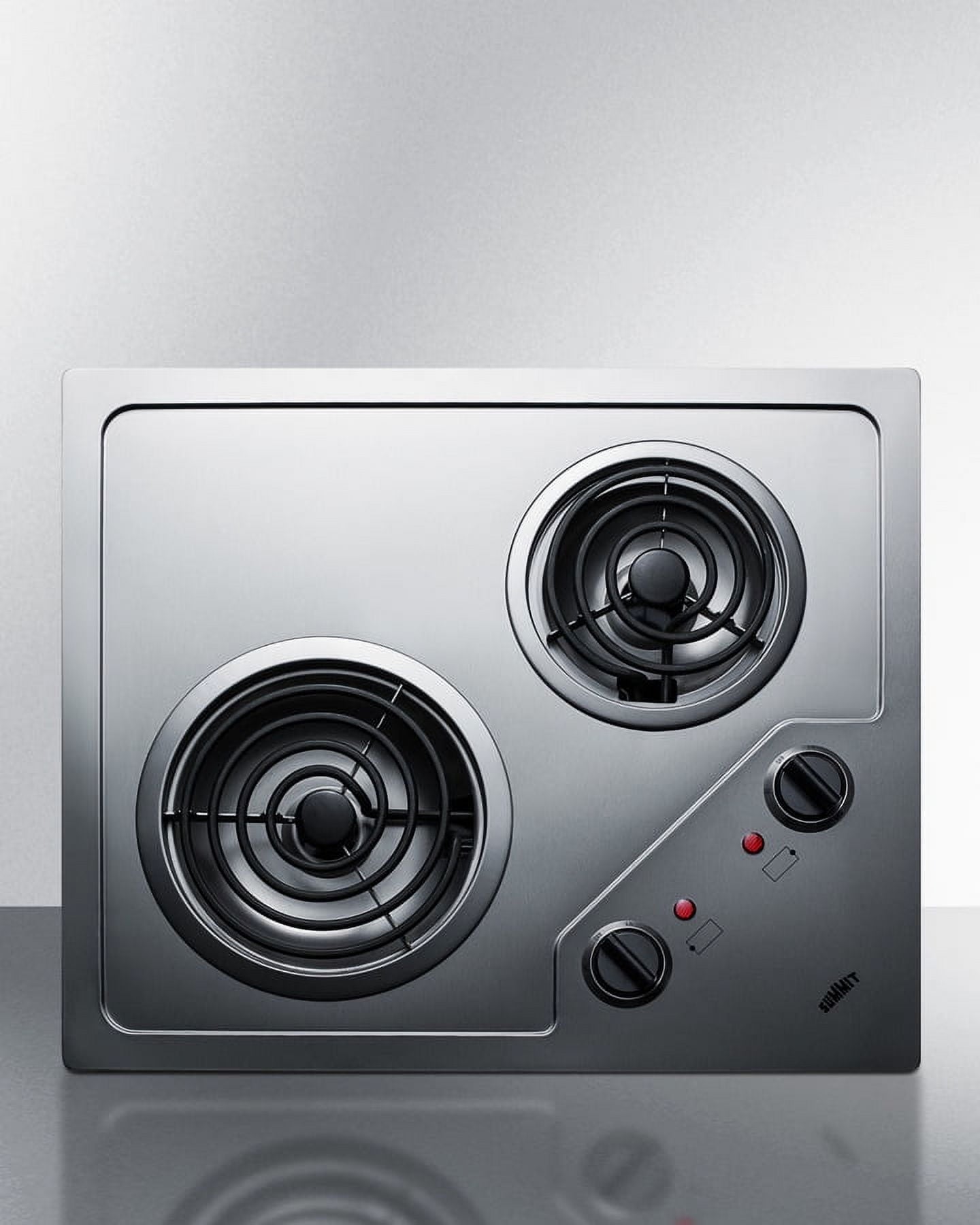 Summit offers a quality lineup of electric cooktops designed to suit any residential or hotel kitchen setup.The CR2B122 is a 120V cooktop made from attractive stainless steel. This unit is designed to fit many common counter cutouts sized 20″ x 16″. The burners and knobs are specially laid out so that they are easy and intuitive to use when the unit is installed in a landscape or portrait configuration. This unit features a large 7″ 900W coil element and a 5 1/2″ 500W coil element, letting you accommodate a variety of sizes. Additional safety features include indicator lights and push-to-turn knobs.With its innovative design and quality construction, the CR2B122 brings modern convenience to a classic cooktop size.