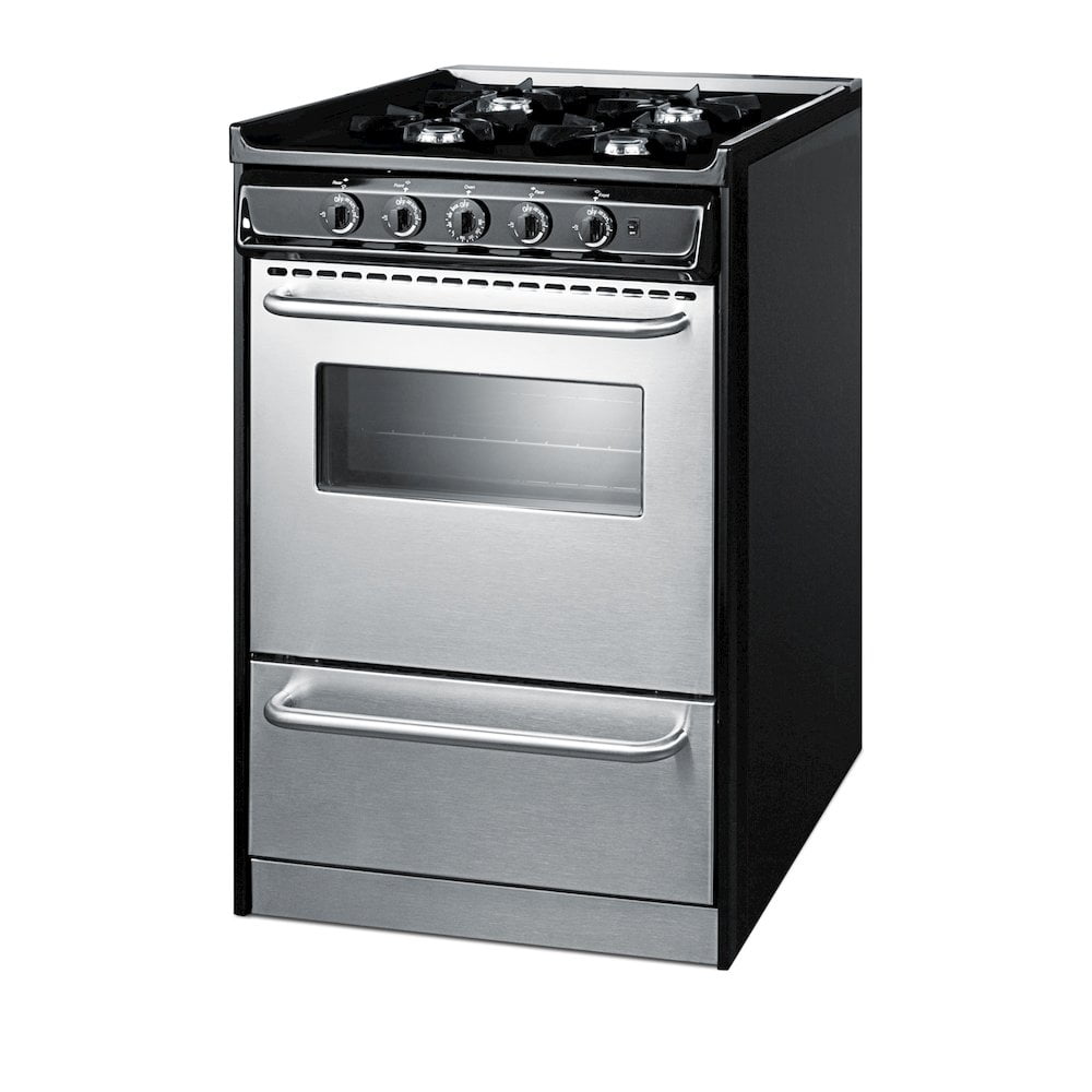 Summit Appliance offers a wide selection of American-made household ranges built for long-lasting durability in space-challenged kitchens. The TNM1107BRW is 20″ wide apartment-sized gas range with a generous 2.46 cu.ft porcelain oven interior that can fit large trays. Two adjustable oven racks are included. An oven window and on/off interior light allow you to easily keep watch over your cooking. The broiler is located below the oven in a drop-down compartment. Four open 9000 BTU gas burners accommodate most of your stovetop heating needs, with upfront push-to-turn knobs that let you adjust your cooking without reaching over hot burners. This unit utilizes an electronic ignition system for added safety. Stainless steel doors feature professional style towel bar handles, bringing classic elegance to smaller kitchen spaces. The low stainless steel trimmed backguard creates a slide-in look, allowing you to customize the space behind your range in the style of your choice. This unit has a recessed oven door and is conveniently sized at just 24″ deep for a better fit in galley in L-shaped kitchens, where every inch counts. With its classic style and quality construction, Summit’s made in the USA cooking line offers reliable cooking for smaller homes. This unit ships ready for natural gas connections. To use with propane, add the Kit LP.