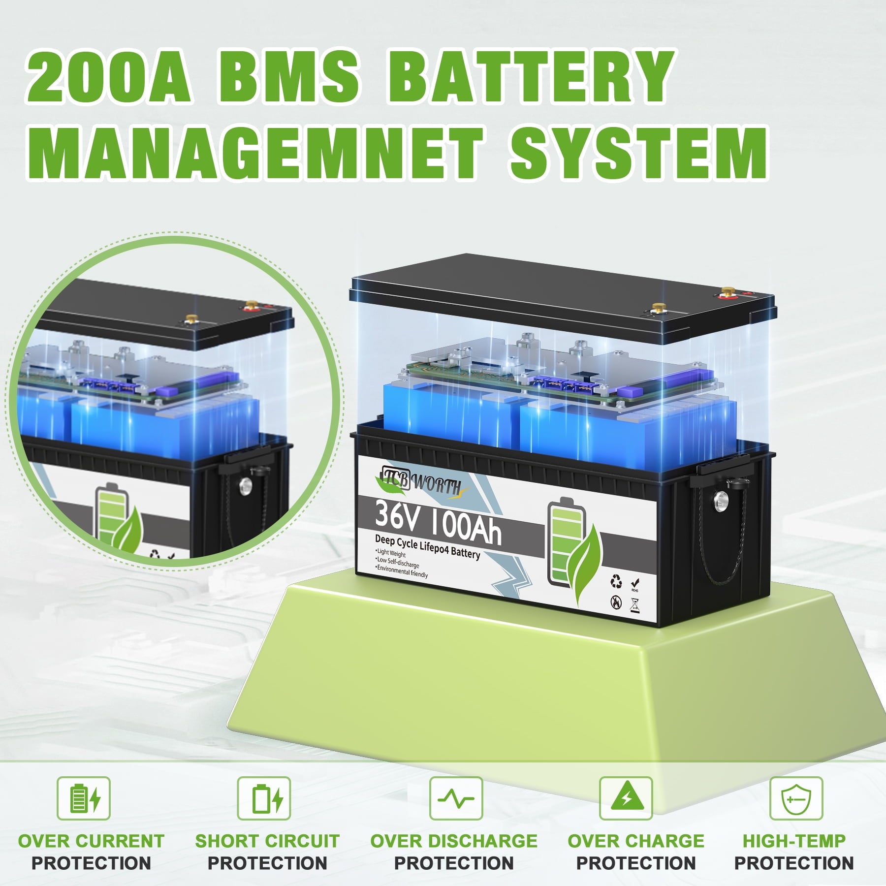 Home Automotive Batteries 36V 100AH Golf Carts LiFePO4 Battery Bluetooth with Free APP Monitor,38.4V TCBWORTH for RV,Marine,Trolling Motor,Solar,Built in 200A BMS,7.68kW Output
