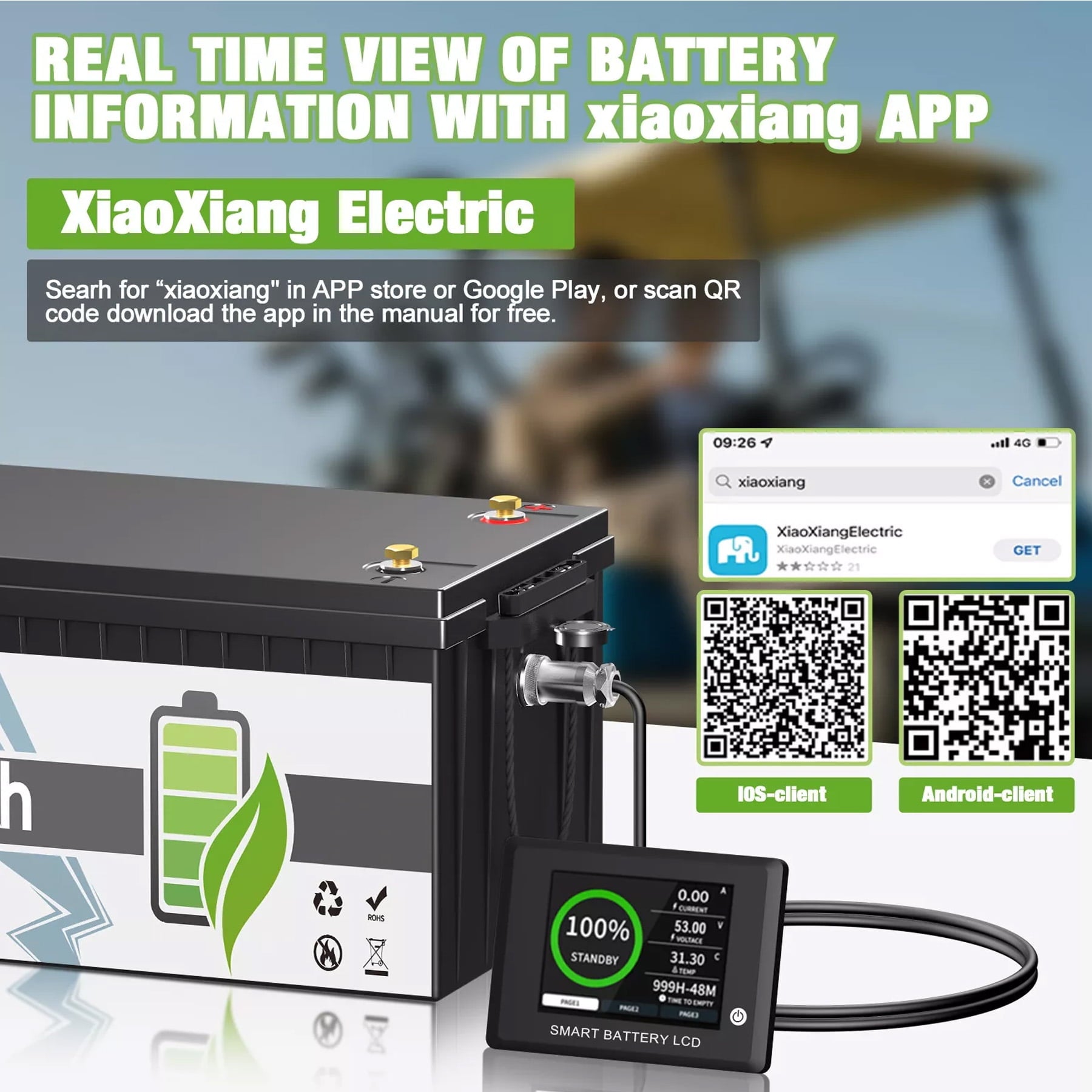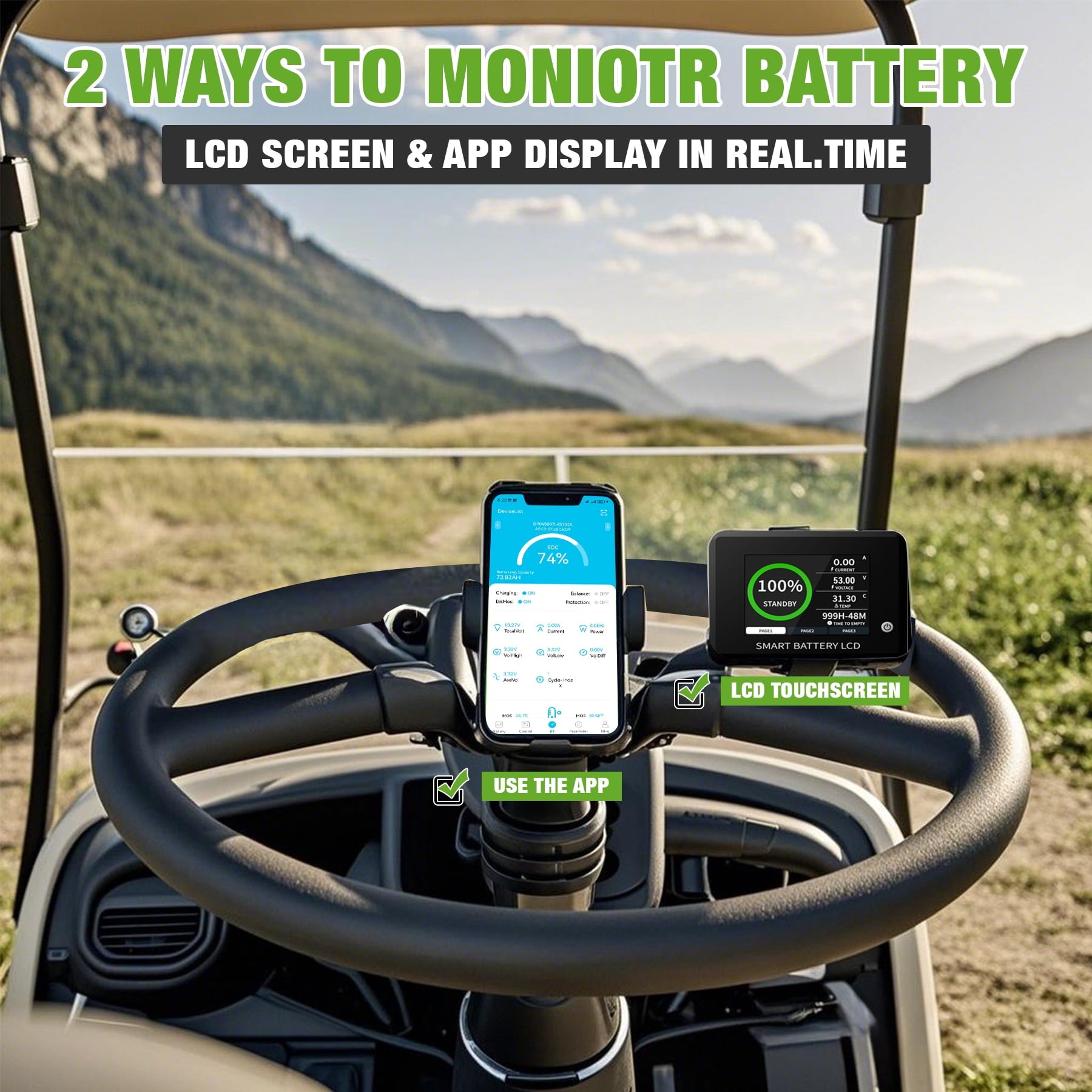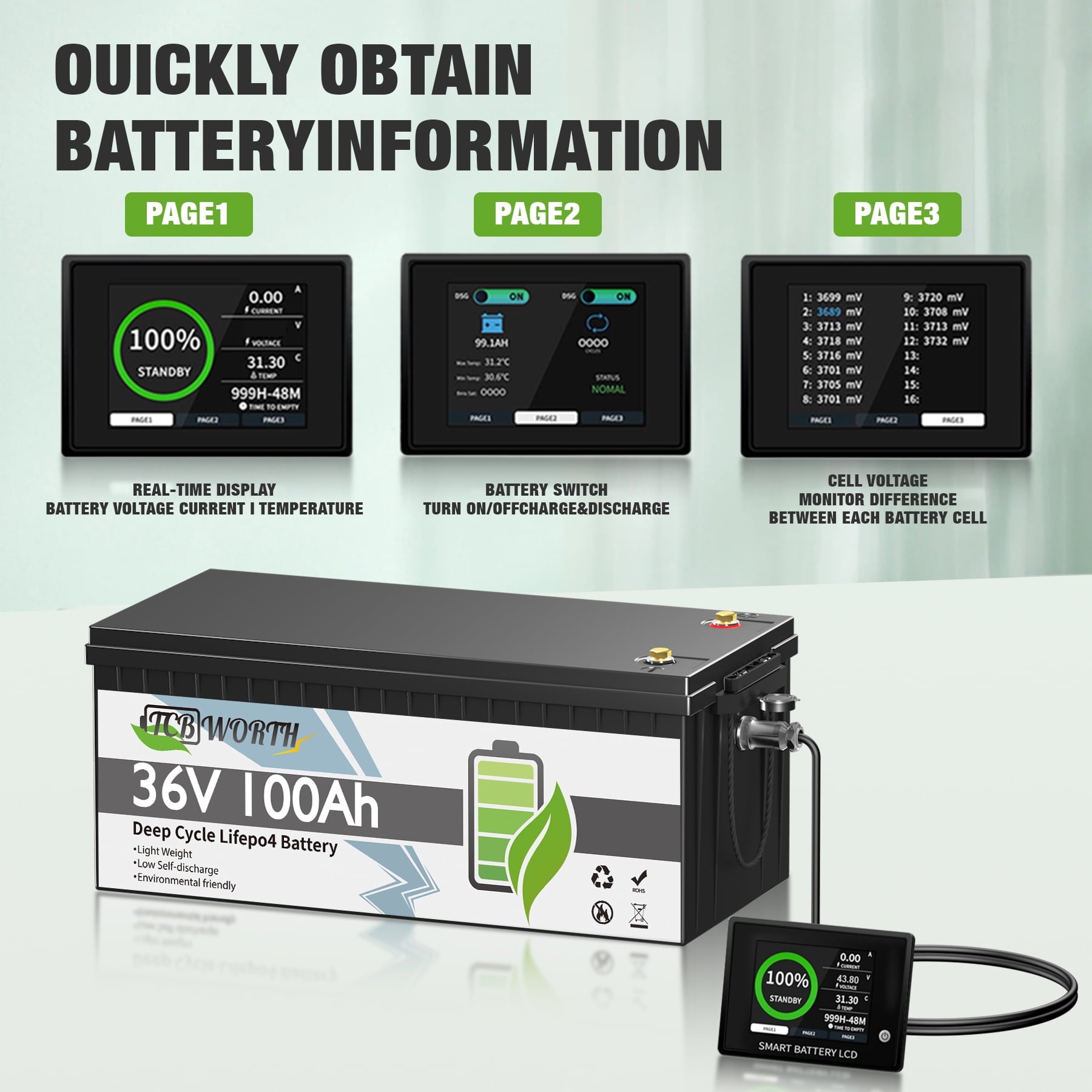 • 【Smart Battery Monitor LCD】 TCBWORTH 36V 100ah LiFePO4 golf cart battery comes with a smart battery monitor LCD, users can check the battery information on LCD in real time, like the discharging/ charging information, every battery cells voltage.