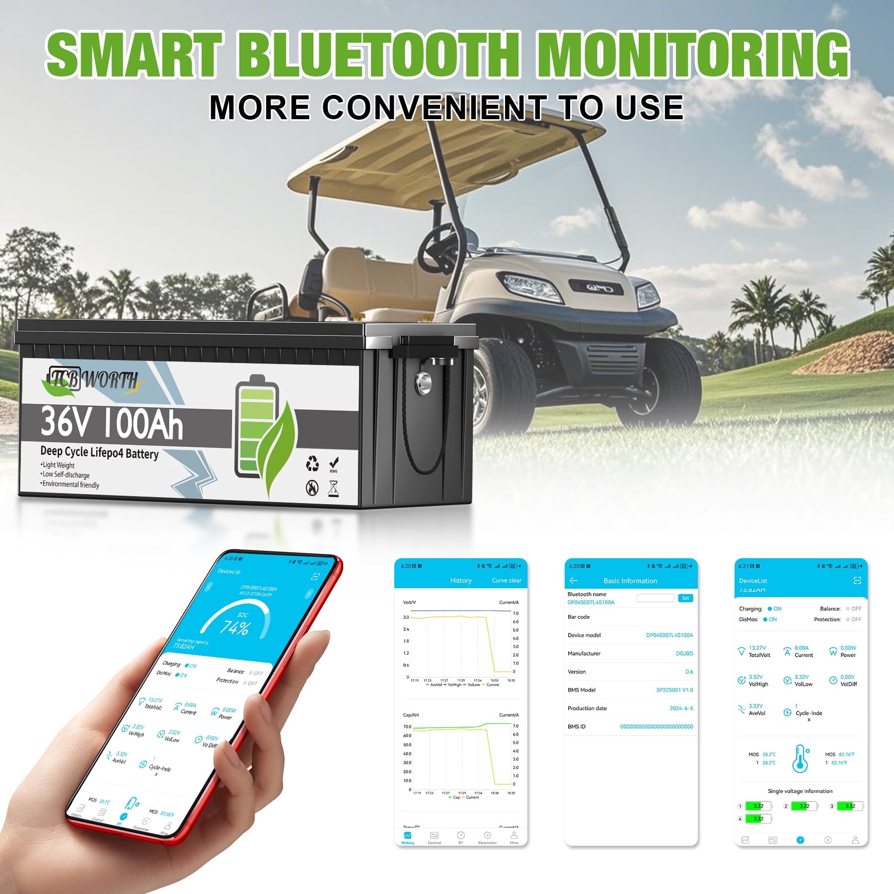 36V 100AH Golf Carts LiFePO4 Battery Bluetooth with Free APP Monitor,38.4V TCBWORTH for RV,Marine,Trolling Motor,Solar,Built in 200A BMS,7.68kW Output