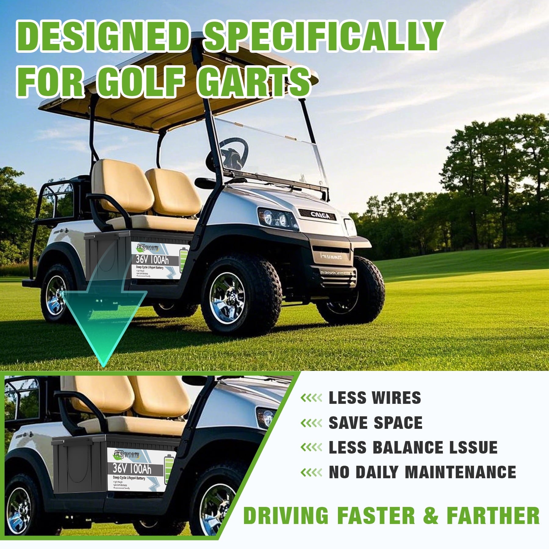 • 【Great for Golf Carts, Easy Installation】The 38.4V 100Ah LiFePO4 battery is designed specifically for golf carts.This 36V 100Ah Lithium battery ensures higher energy density and stability, with a lifespan of up to 10 years and 5000+ deep cycles, easy installation,delivering truly superior performance.Suitable for Club Car, EZGO, ICON and Yamaha golf carts.