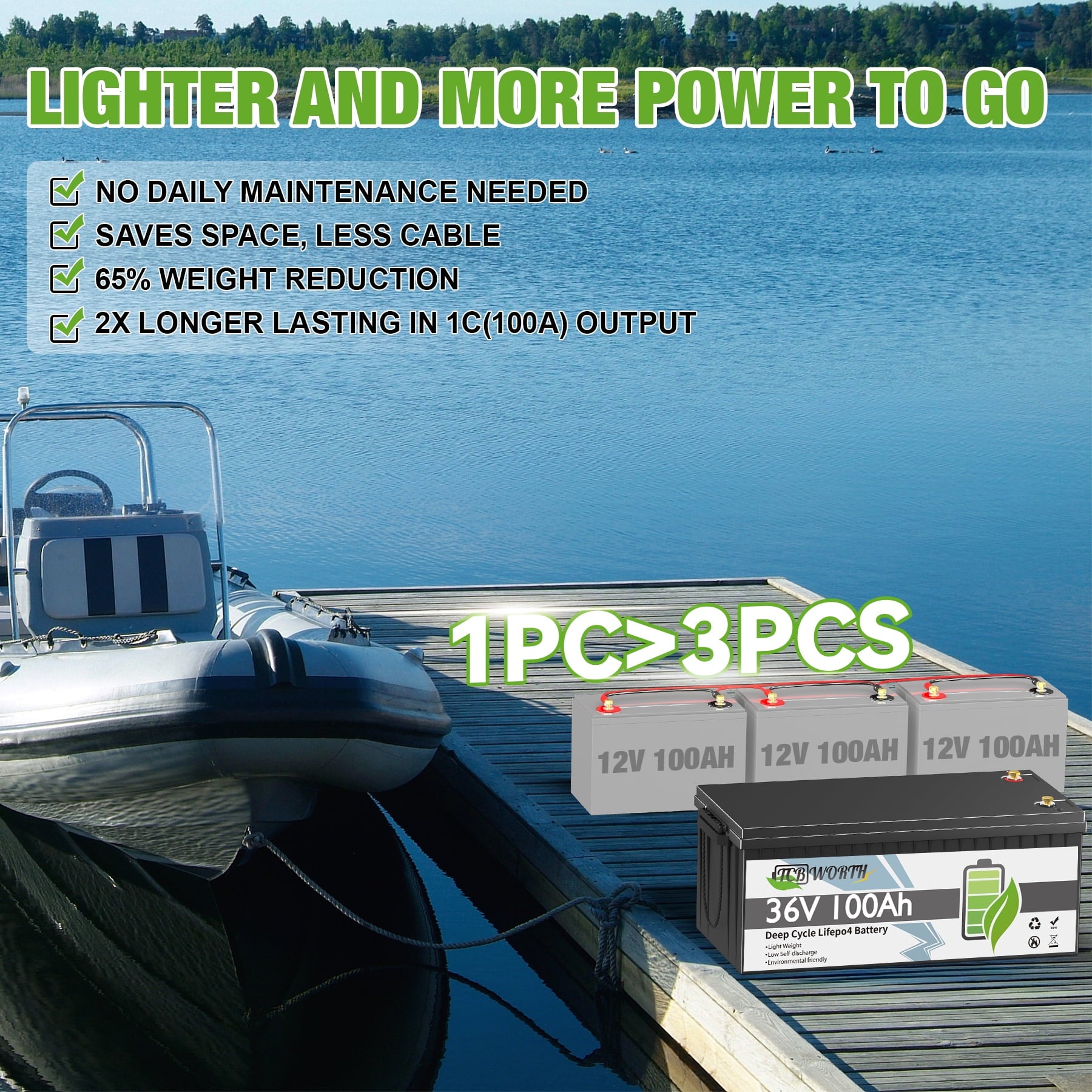 • 【10 Years lifespan & 1/3 Lightweight】 The LiFePO4 battery 36V 100ah provides 5000~15000 cycles, which is more than 10 times to a lead acid battery with 200~500 cycles. 36V 100Ah LiFePO4 RV battery has a 10-year service life, three times longer than the lead acid’s 3-year. It weighs only 1/3 weight of lead acid batteries, which is portable and easier to take out in outdoor applications.