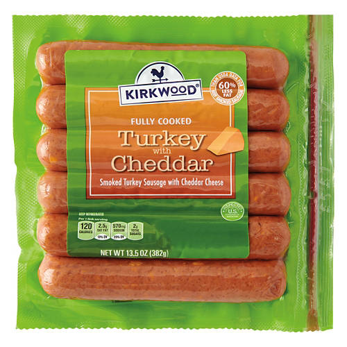 Swap out these Kirkwood Turkey Cheddar Sausages for your standard hot dogs to instantly elevate your meal! Made with premium cuts of turkey, each smoked sausage is stuffed with sharp cheddar cheese for a perfectly savory bite every time. Team yours with a toasted bun and your favorite condiments for a delicious and flavorful dinner!