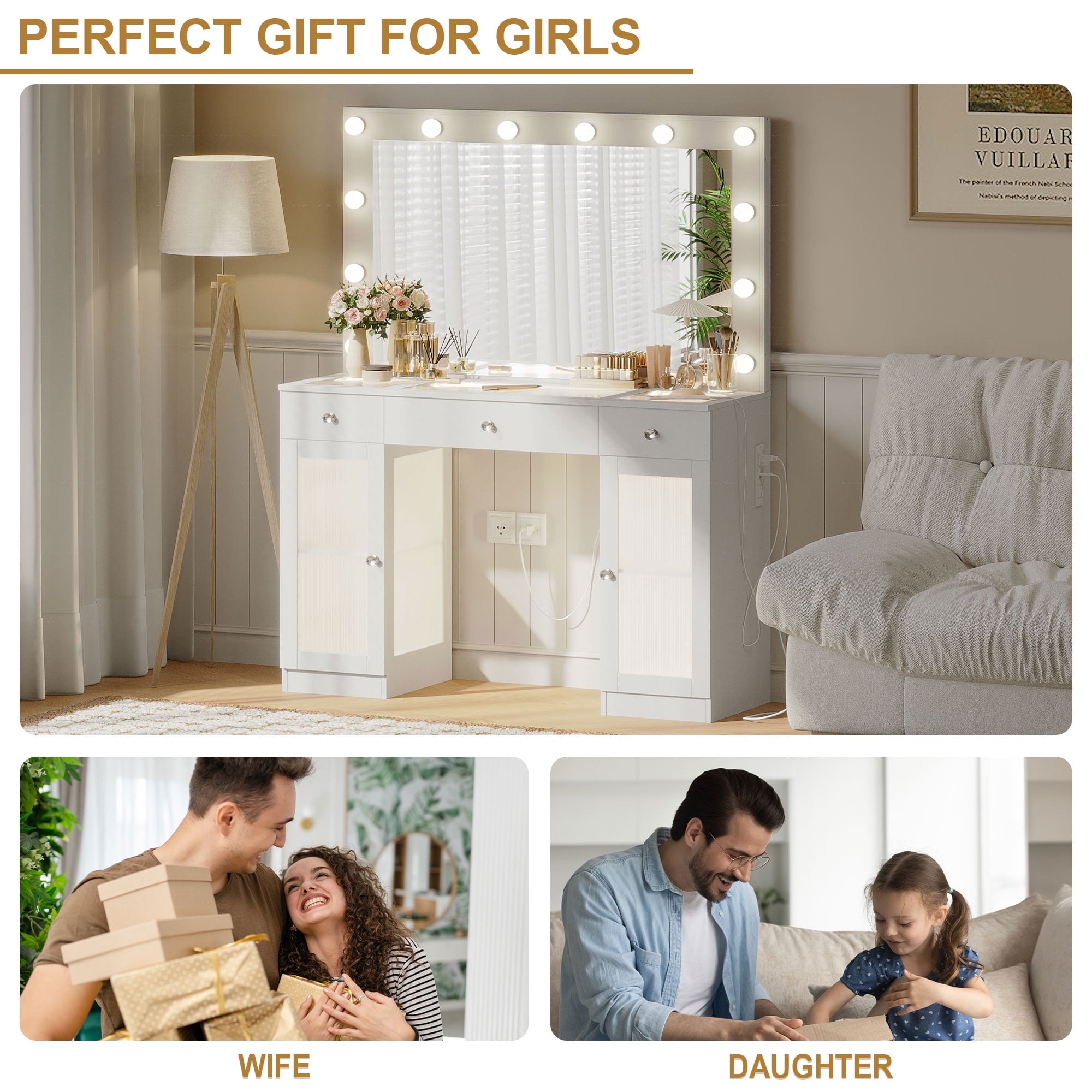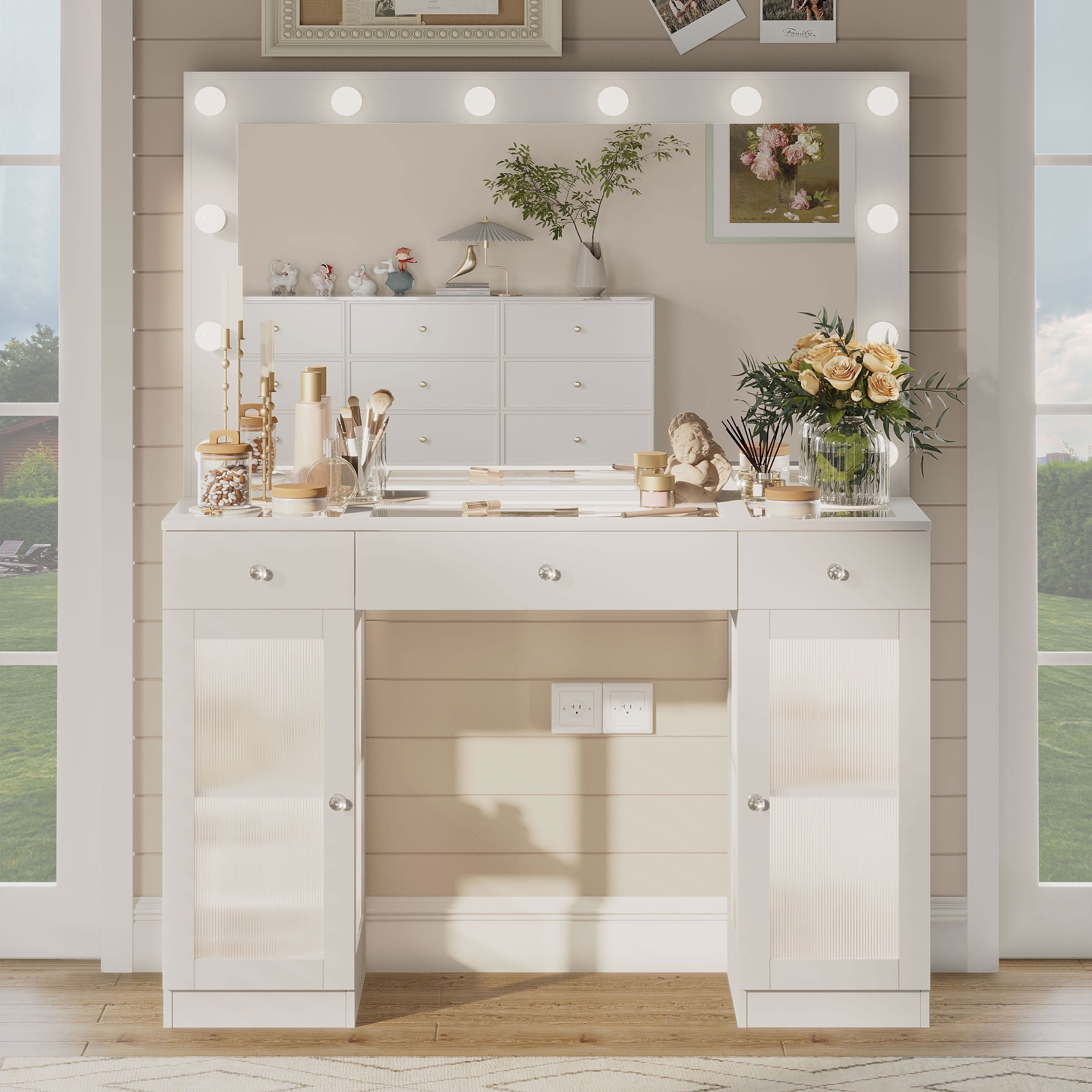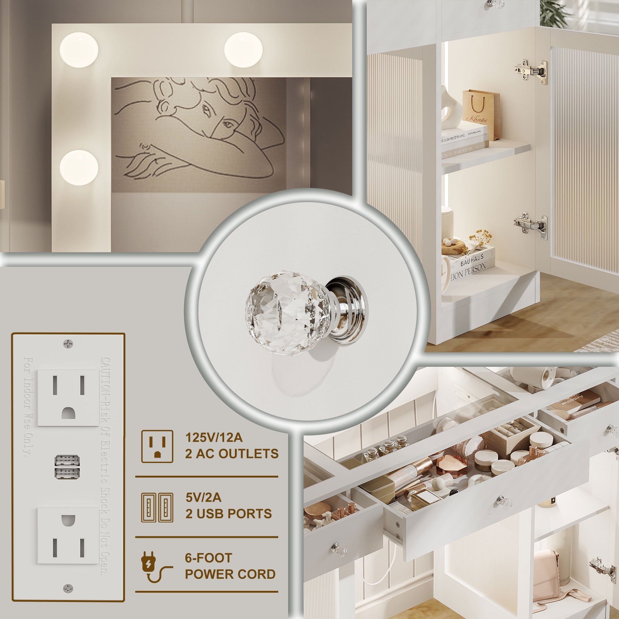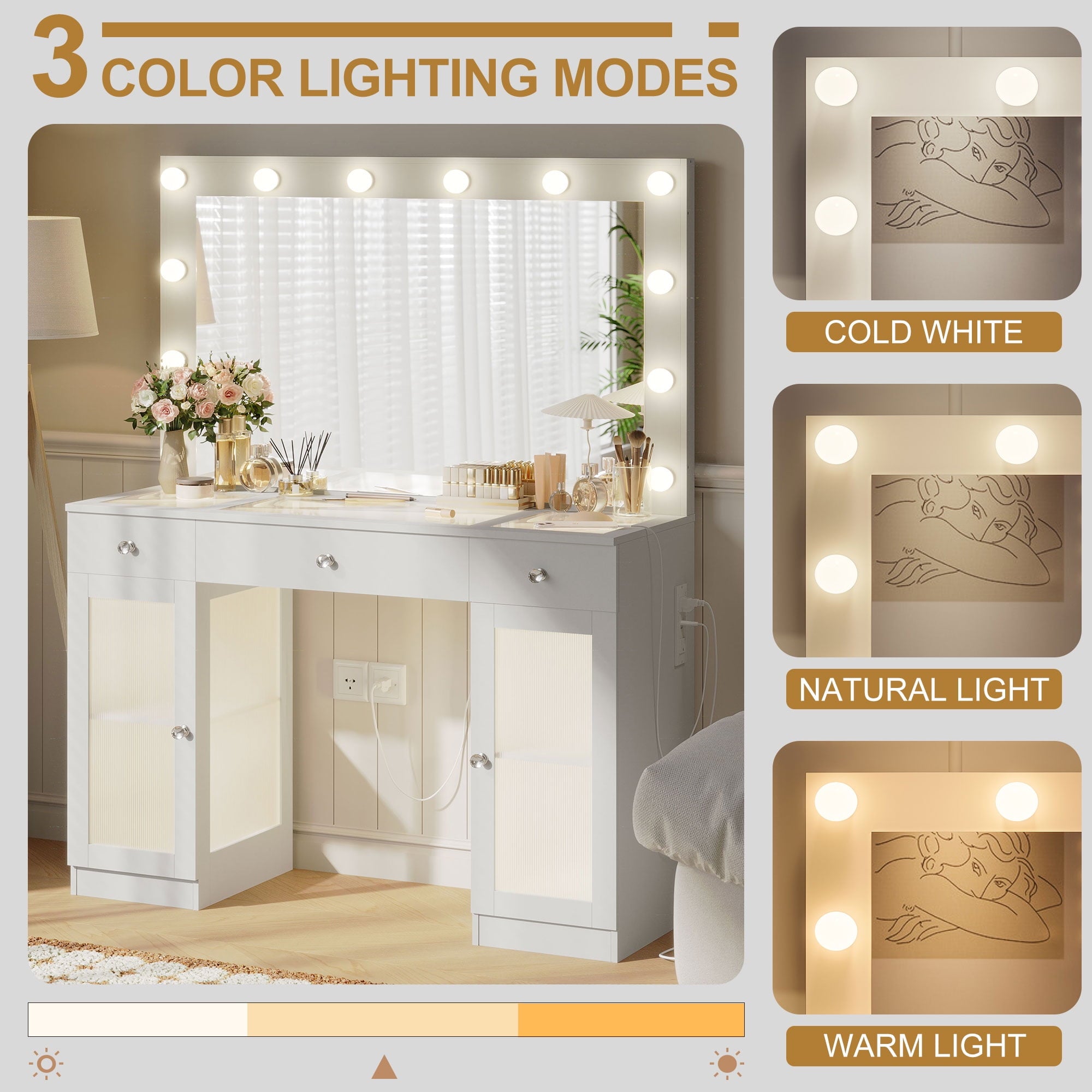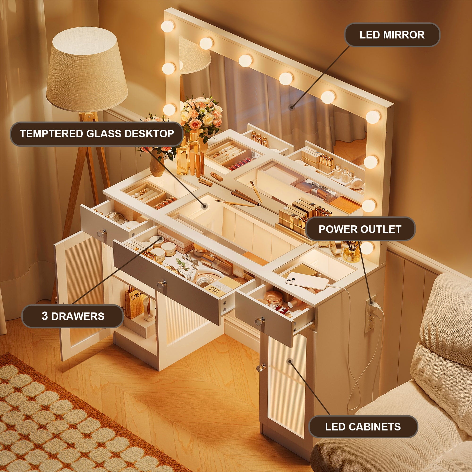 This multifunctional Makeup Vanity is uniquely designed to add a touch of refinement to your room. This large dressing table has four shelves, a spacious composite glass tabletop, three drawers, and two cabinets to help you better organize your items. The transparent desktop and cabinet door allow you to see a variety of beauty tools at a glance, equipped with a charging station, 2 standard power sockets, and 2 USB ports for easy use on mobile devices. If you are still looking for a beautiful and practical dressing table, don’t hesitate, come and buy it now!