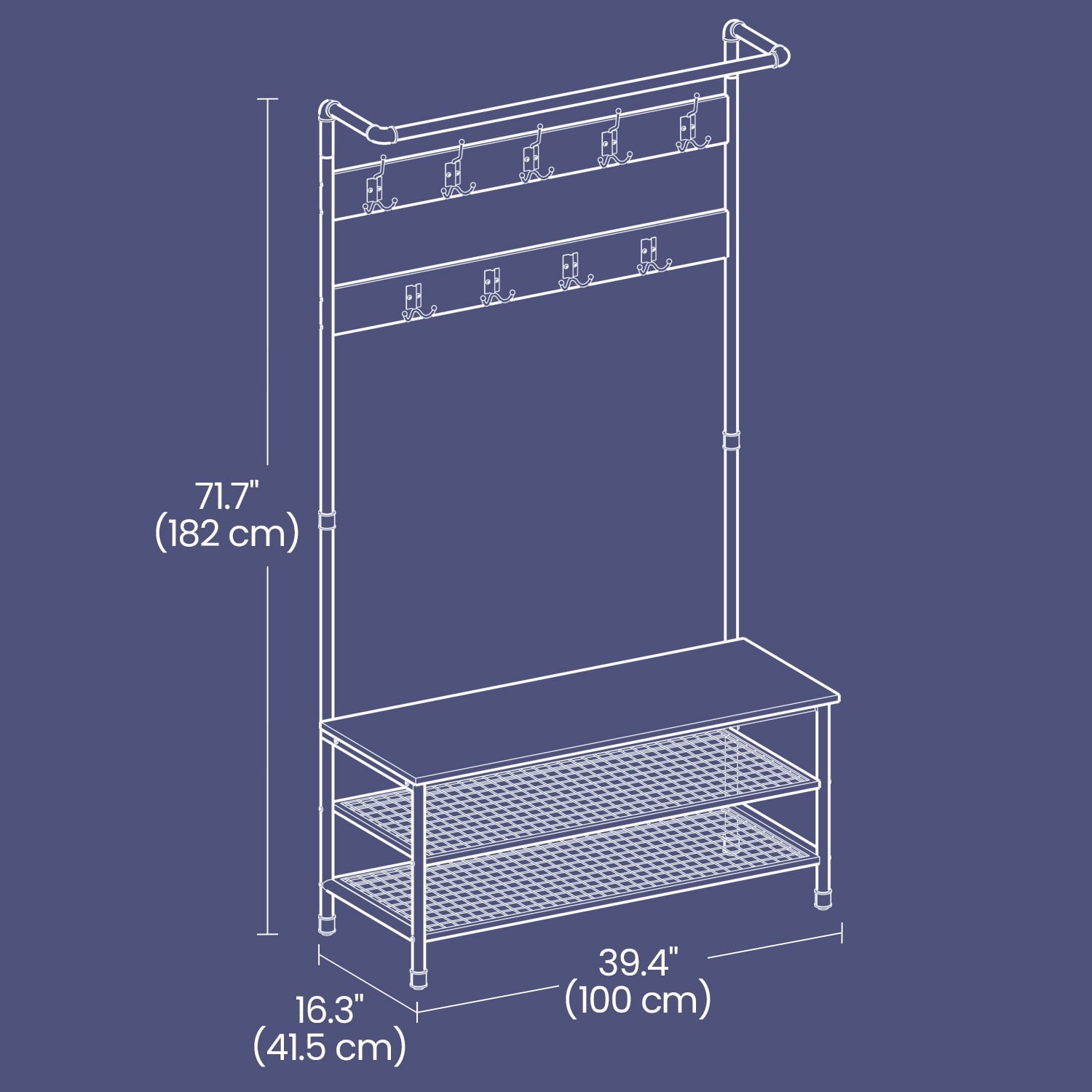 - After coming back home at the end of the day, just hang your coat, hat, and scarves on any of 4 dual hooks or 5 tri-hooks, sit on the bench to remove your shoes, and put them on any of 2 metal mesh storage shelves