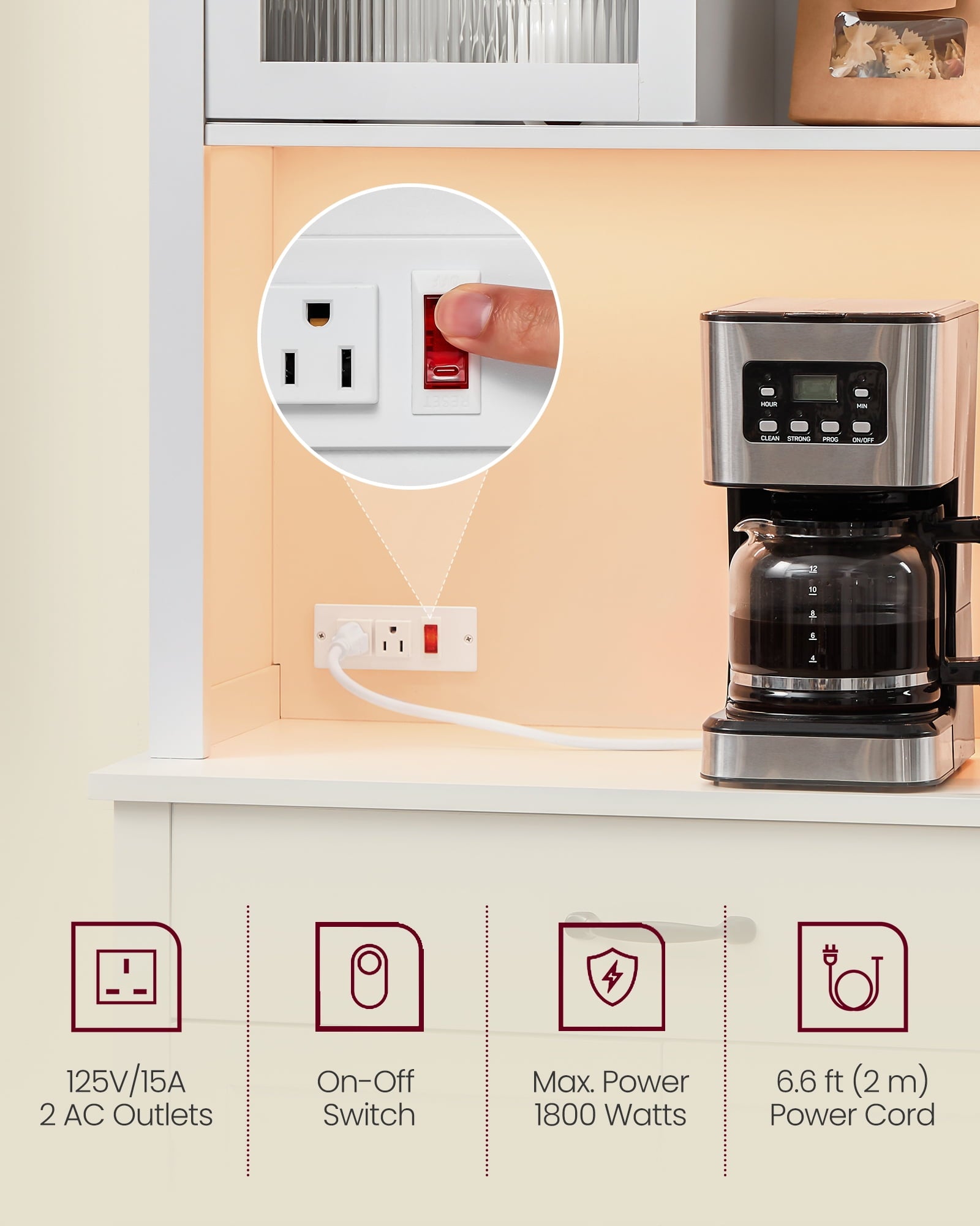 • [Built-In Charging Station] This kitchen cabinet includes a power strip with 2 AC outlets, making it easy to power kitchen appliances like microwaves or coffee makers. For added safety, an on-off switch allows you to turn off the power when it’s not in use