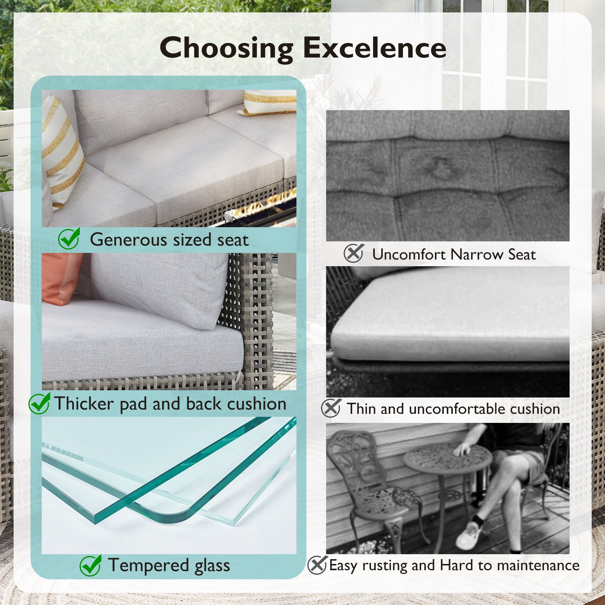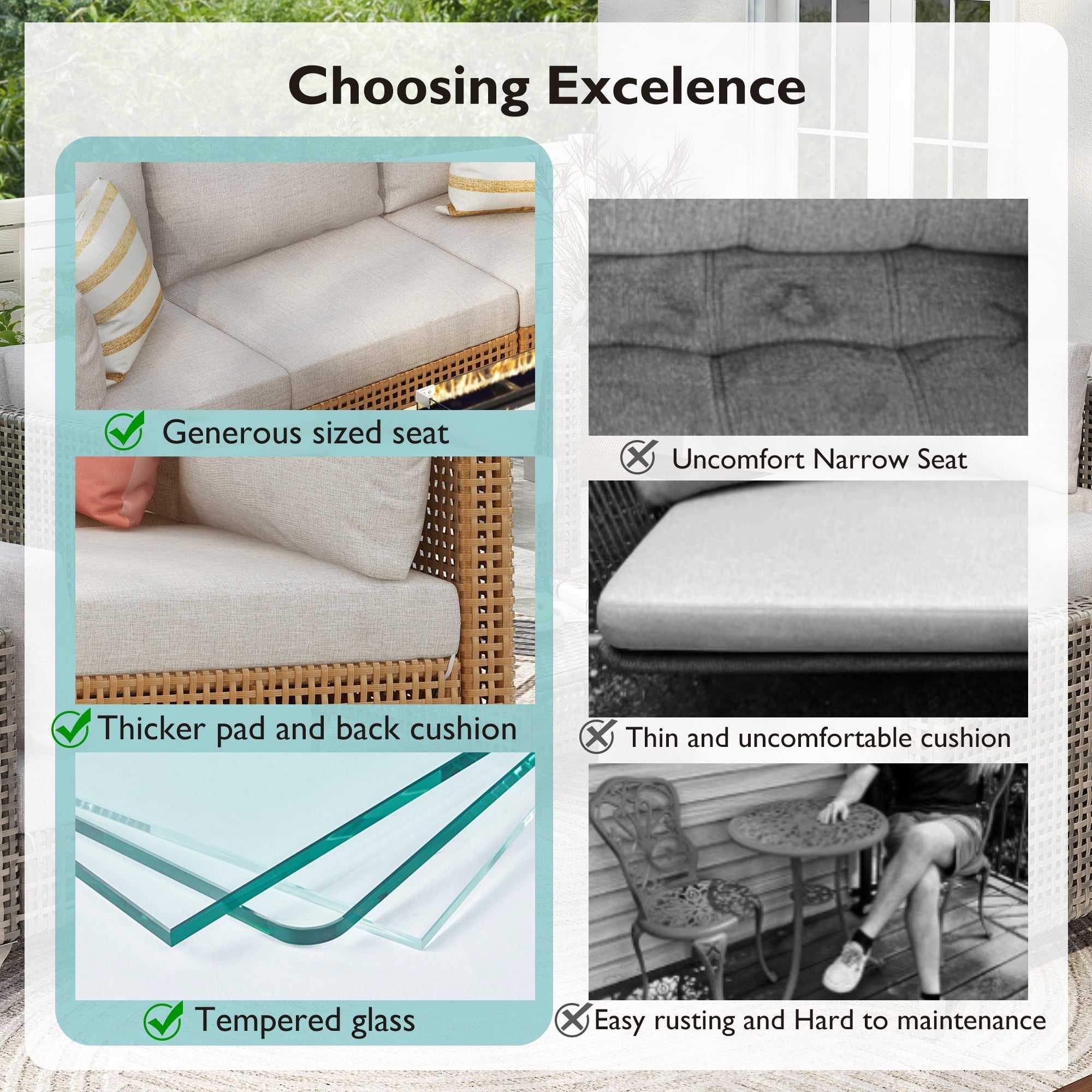 The 7 pieces of outdoor patio furniture sets with thicker lofty sponge-padded seat cushions and backrests provide extraordinary comfort while relaxing in your leisure time. Wide and deep chairs will provide enough room to sit comfortably.