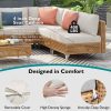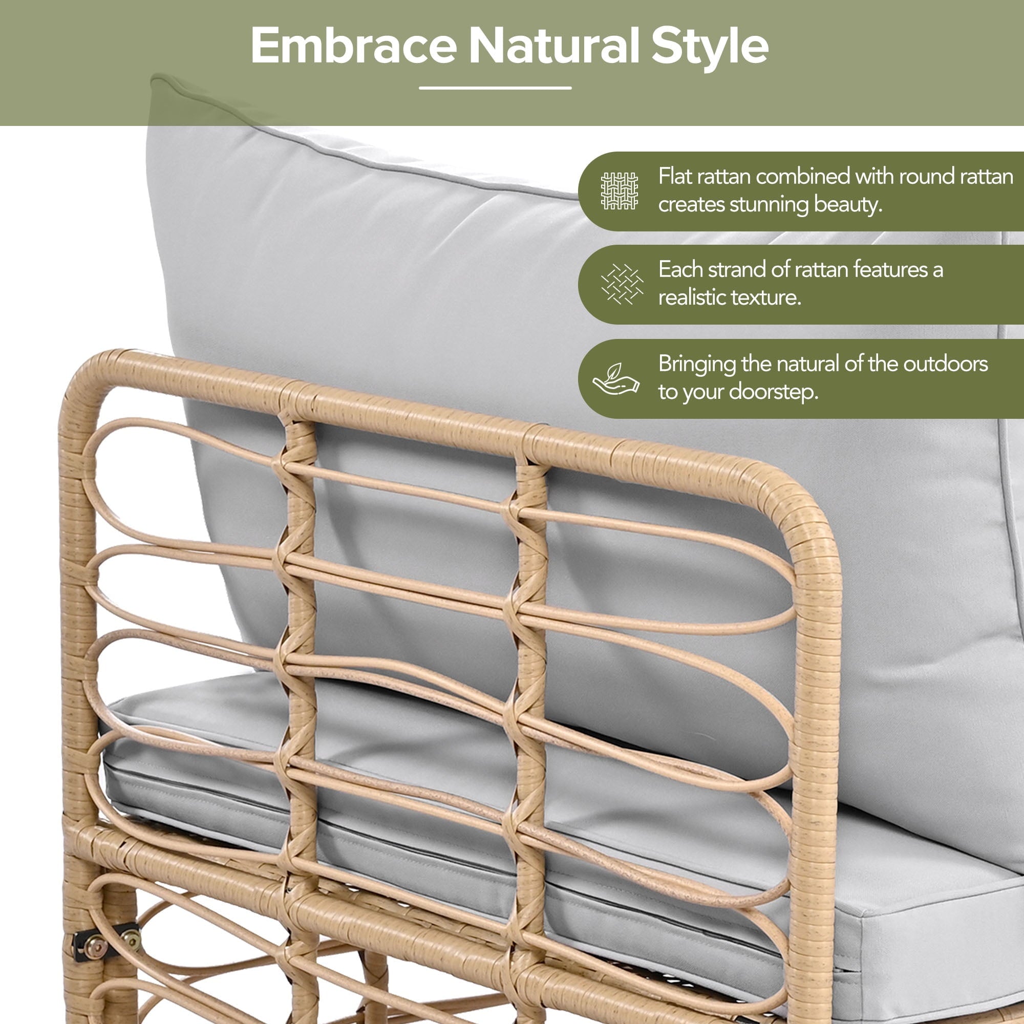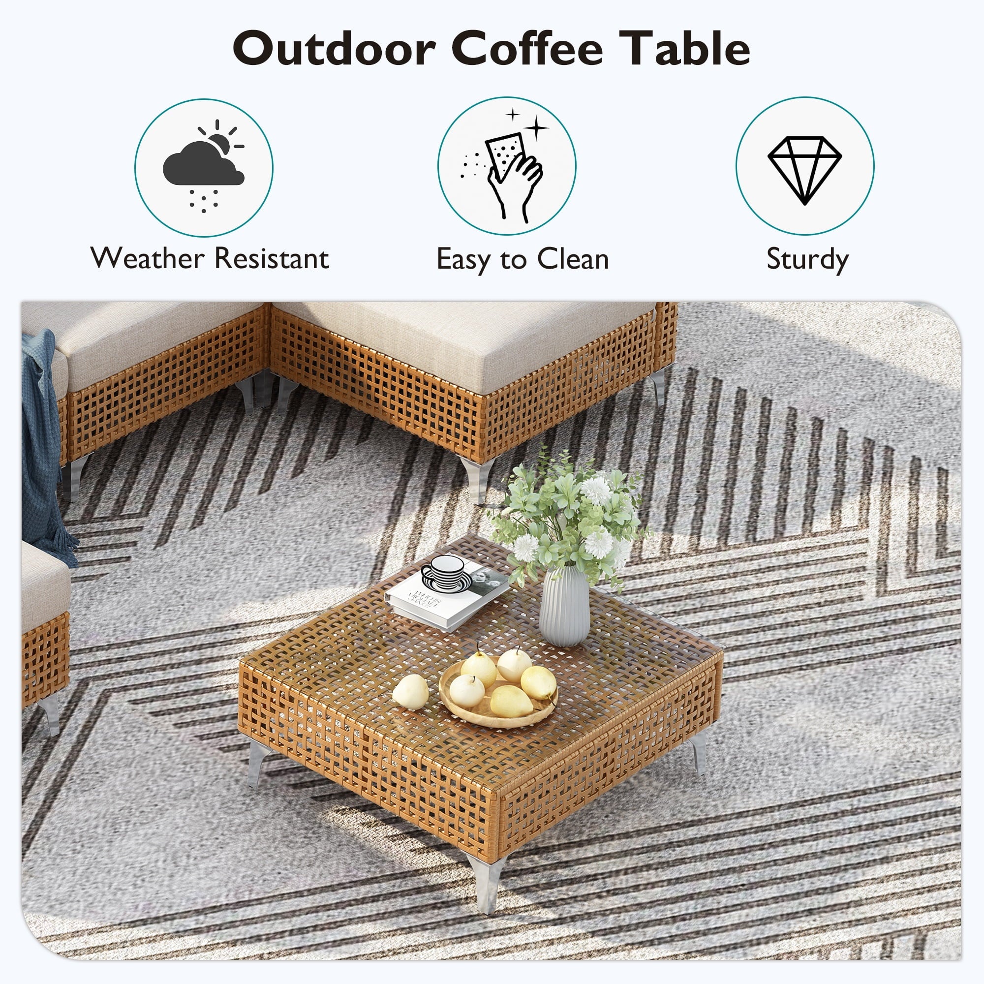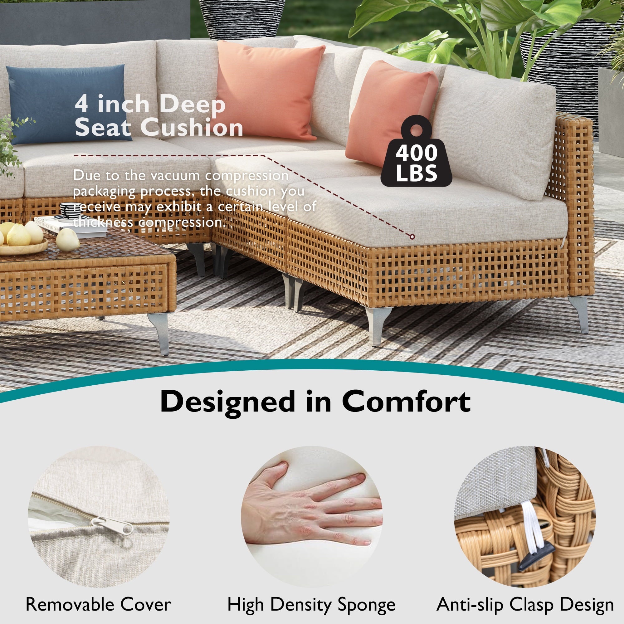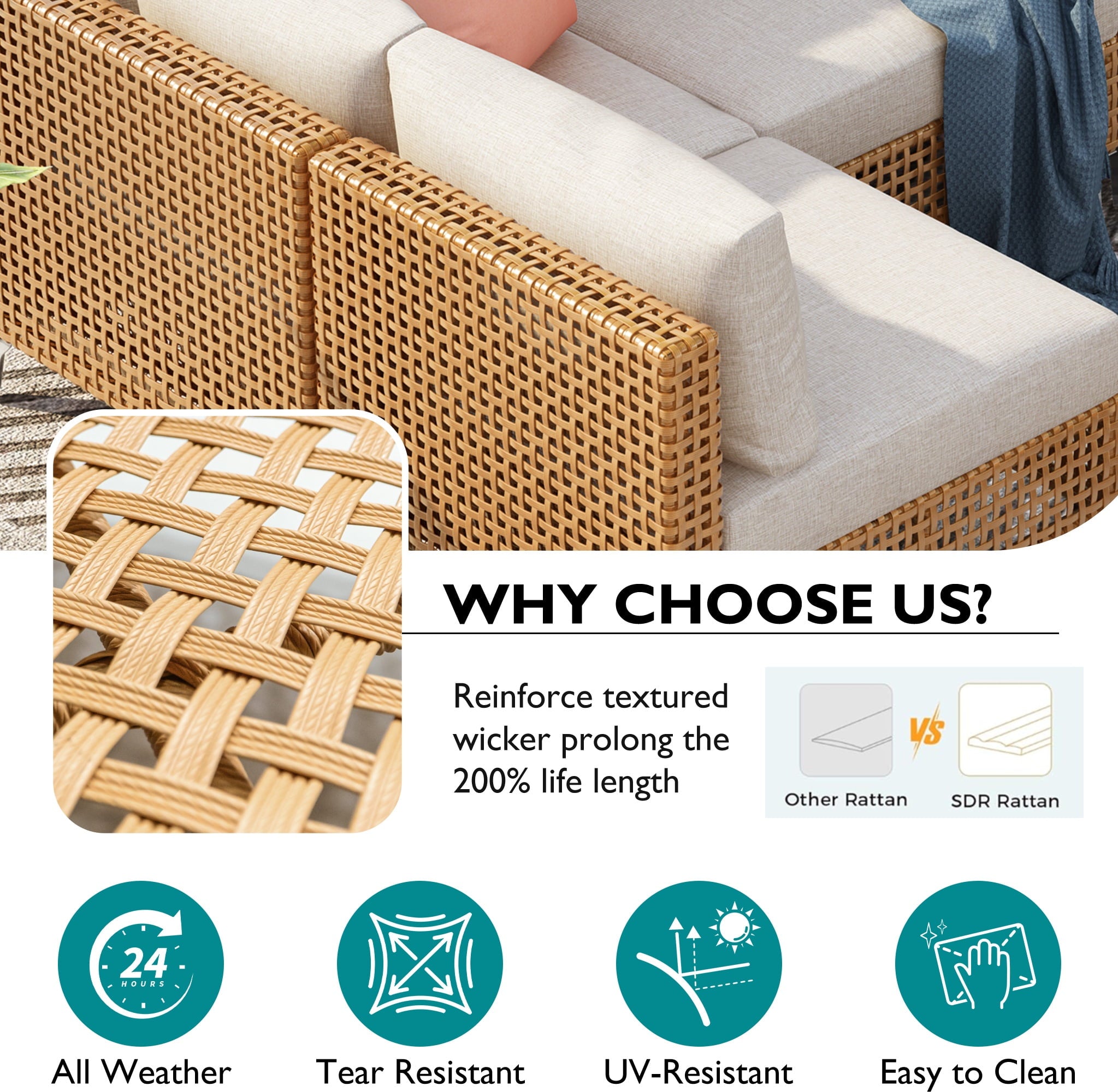 This outdoor sectional sofa set is made of a solid powder-coated cross-structure steel frame, rustproof and sturdy; hand-woven PE wicker offers high tensile strength, and water resistance, which is strong enough to withstand all-weather variations for