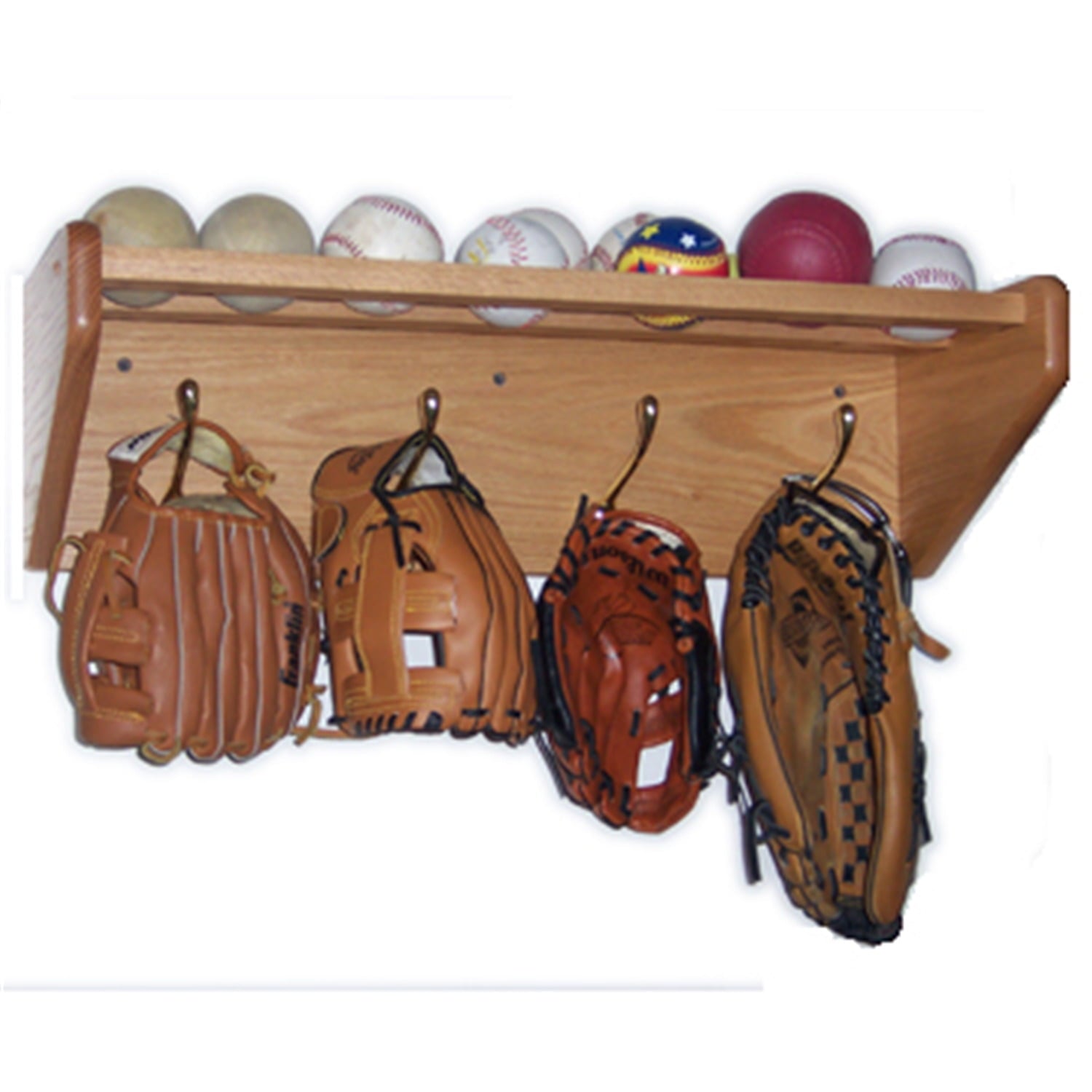 - Shelves are made of solid oak and heavy-duty brass or nickel hooks for extra durability.