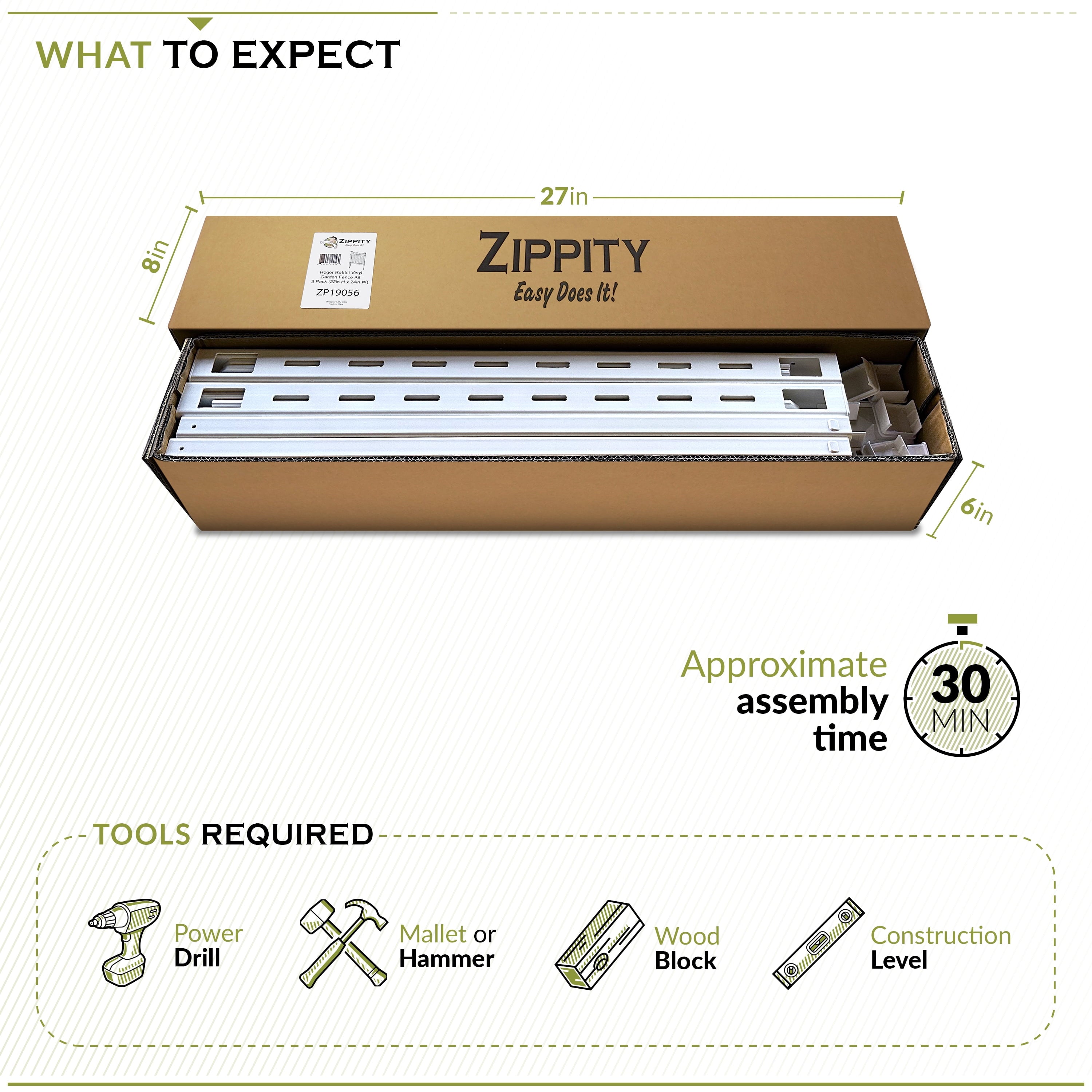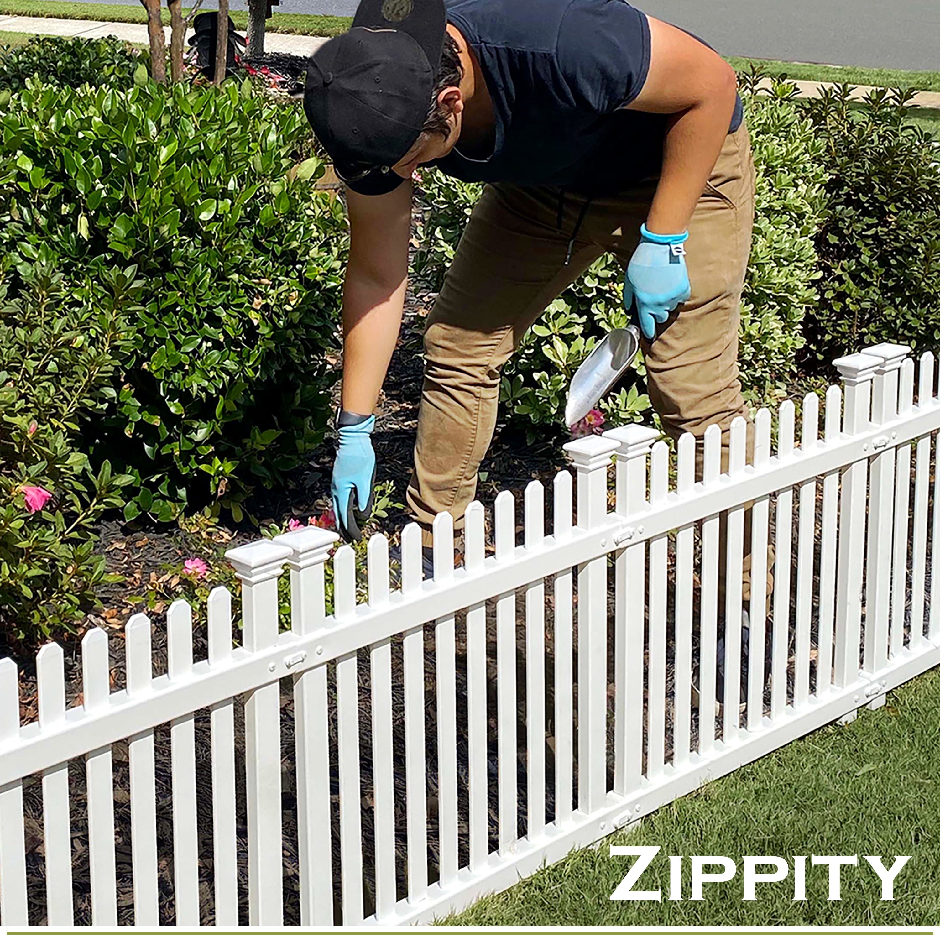 Zippity Outdoor Products Roger Rabbit 2 ft. H x 2 ft. W Vinyl Fence Kit. This picket fence beautifully compliments your garden and protects your plants from unwanted guests. Made with vinyl that is virtually maintenance-free. No painting or staining required. Simply insert the included stakes into the ground allowing for worry free installation. Assembly time is approximately 30 mins.