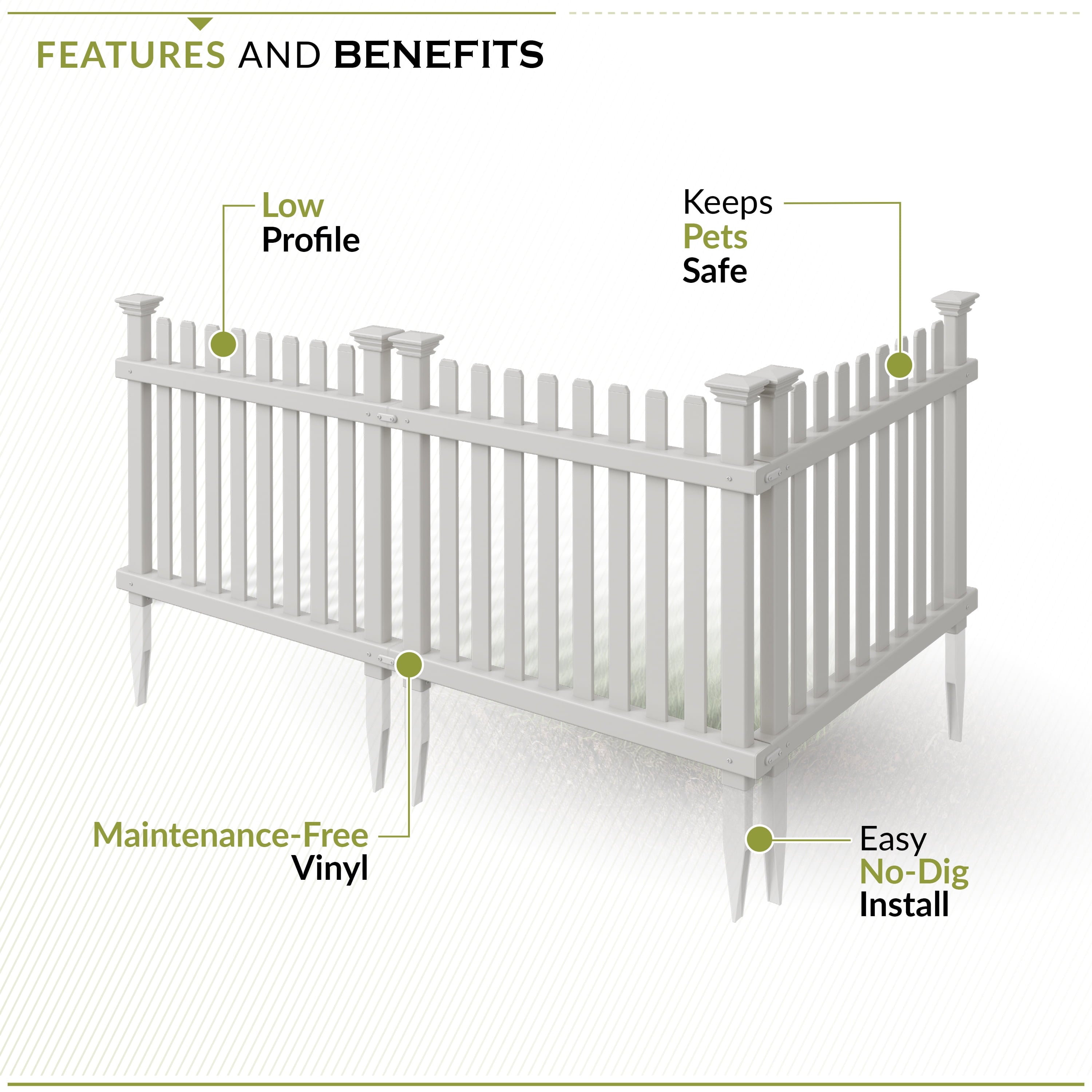 • EASY INSTALL: This no dig garden fencing is easy to install! The temporary fence is easily removed and re-installed. The small white picket fence creates a garden fence border that will enhance your landscaping.