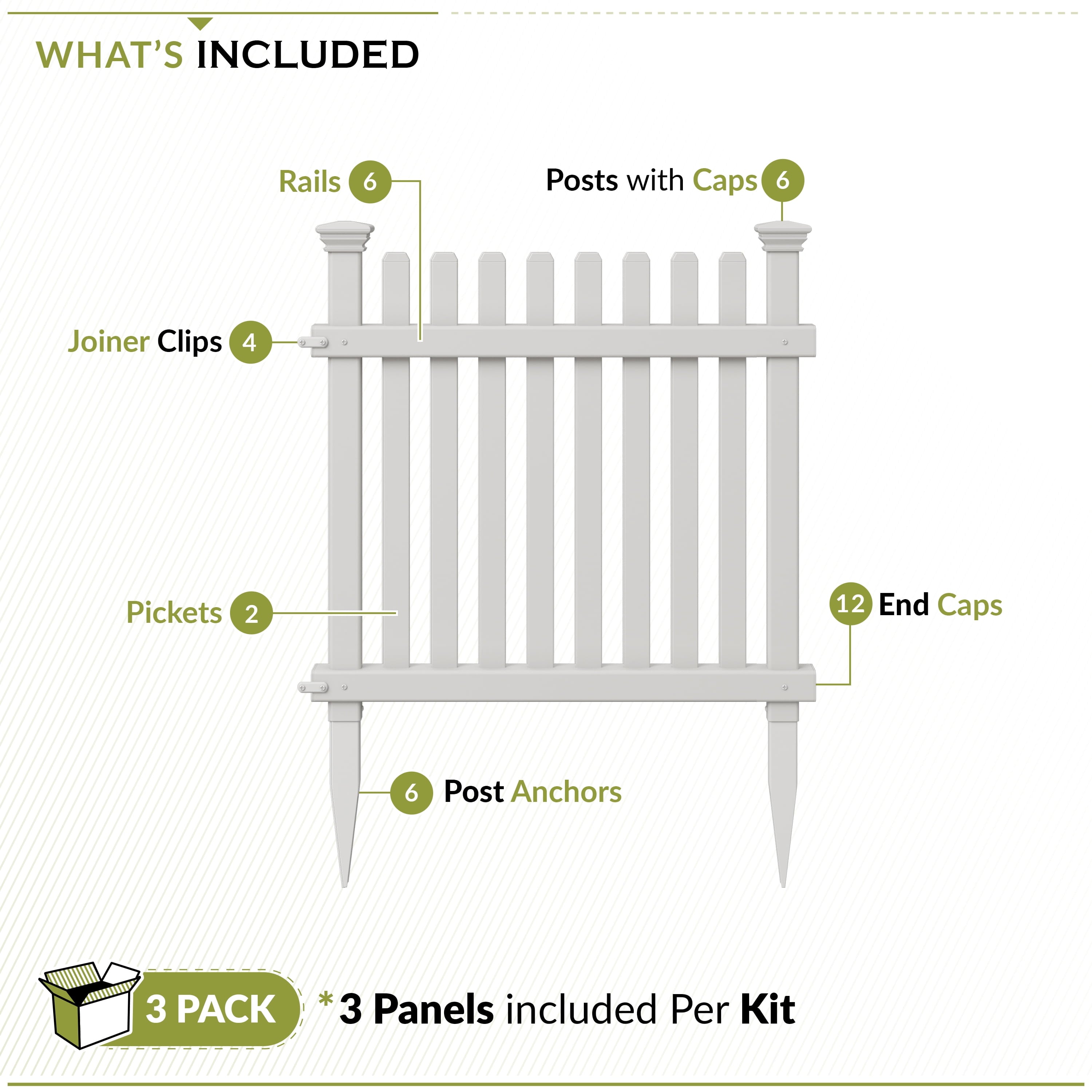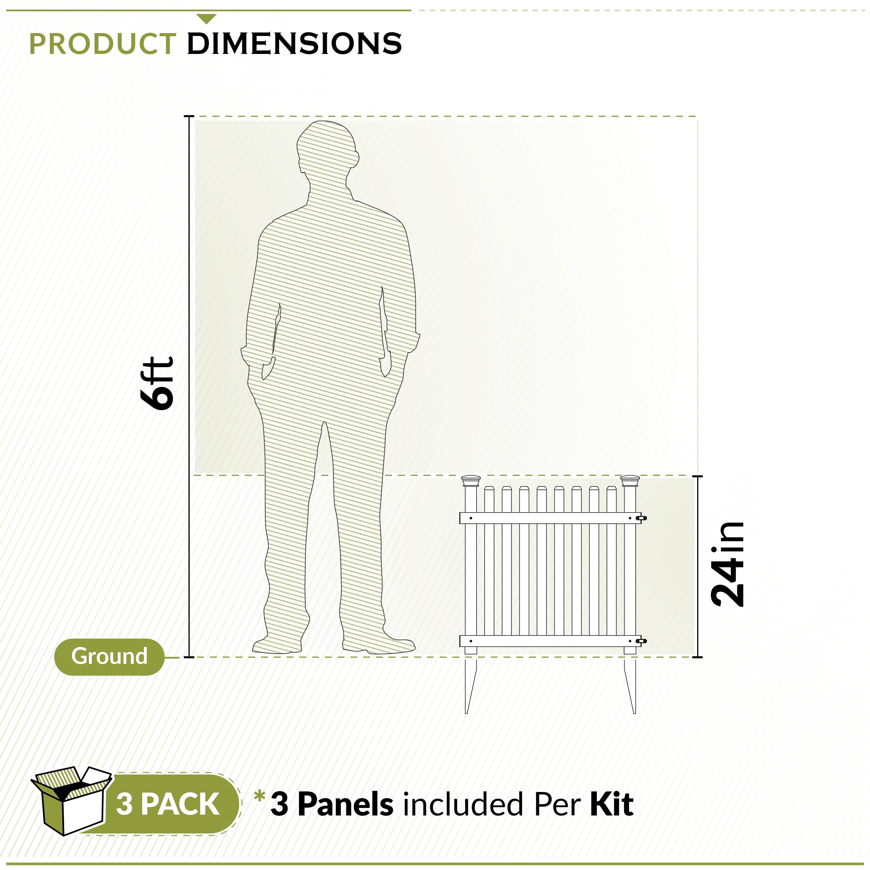 • DIMENSIONS: Each panel measures 24″ W x 24″ H. One box comes with 6 total linear feet of white vinyl picket fence for your garden.